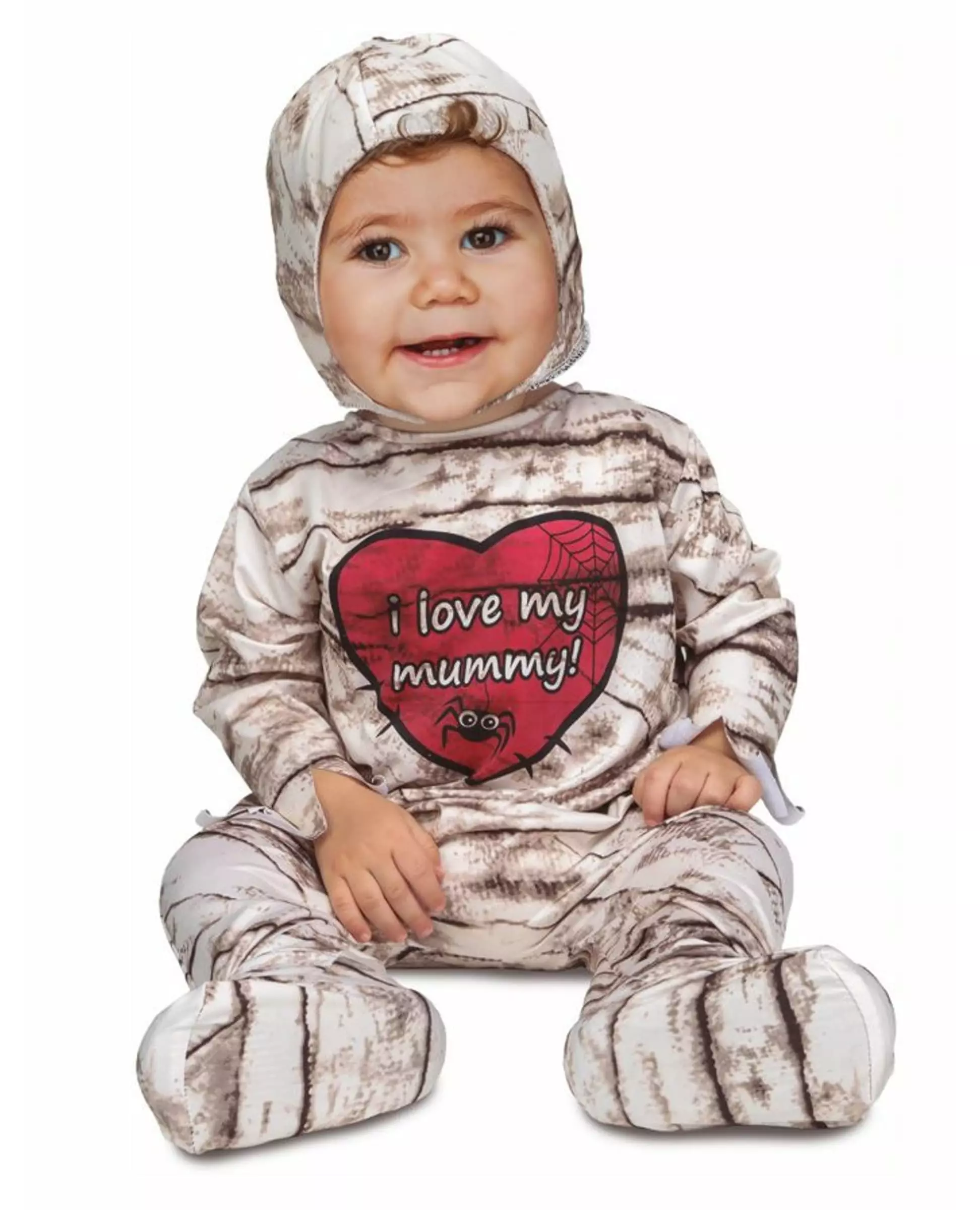 Mummy outfit for children, with a lovely dedication for mom! This baby mummy costume includes a jumpsuit and hat. The jumpsuit imitates the bandages wrapped around the mummy for embalming. But the element that will make your baby the cutest mummies is the enormous red heart on the chest, on which is written "I love my mummy!". As you can see, it's a play on words that means "I love my mom!" How can you resist so much cuteness? The hat has the same imitation as the jumpsuit and has a fastener for easy on and off! Your little monster is ready to come out of his sarophage for Halloween!. Accessories included: Jumpsuit Hat Material: 100% polyester Care: Hand wash