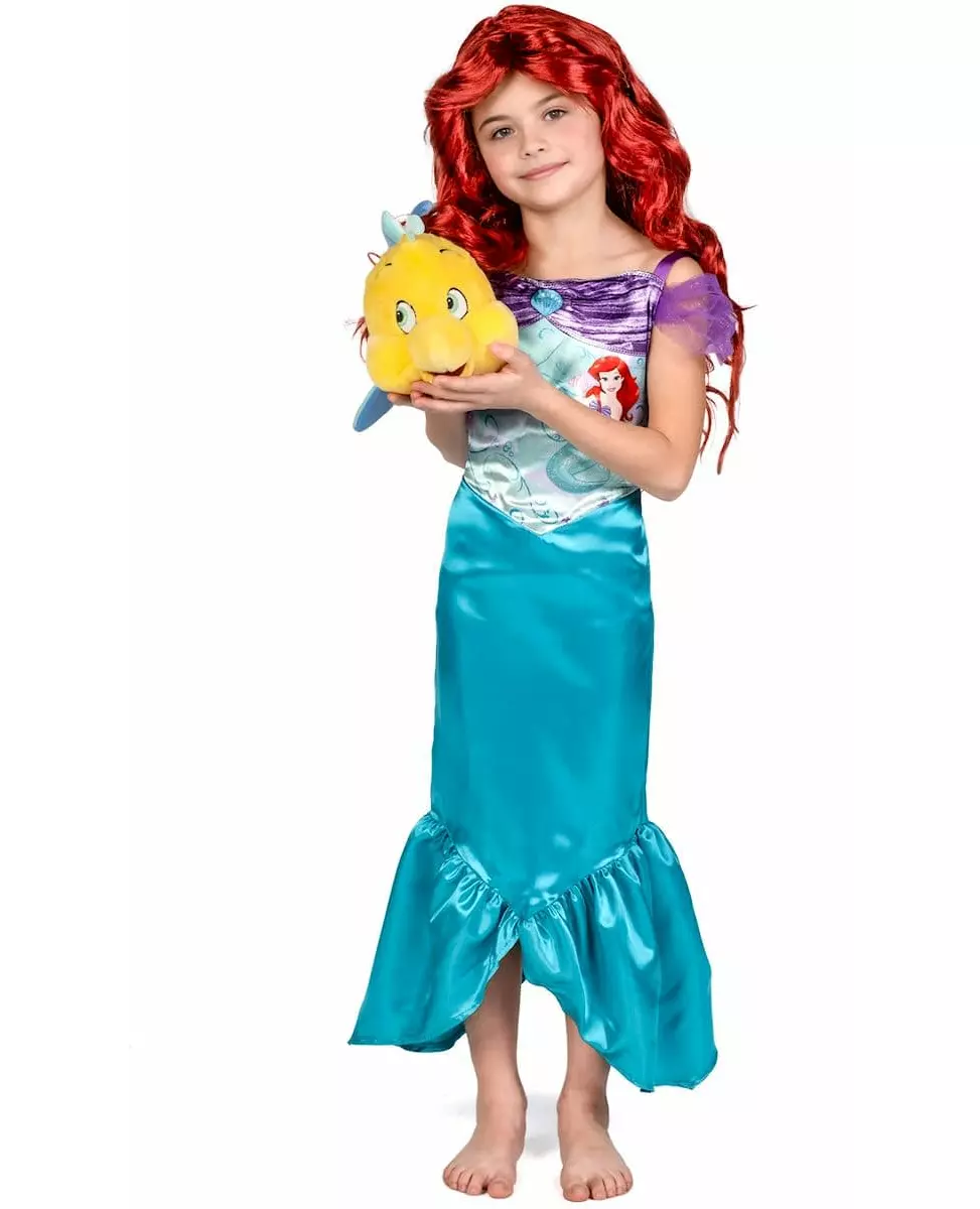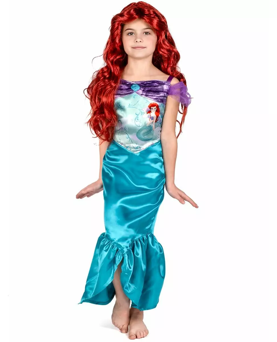 No, not a jellyfish with a mustache! This Ariel the Little Mermaid costume for girls is officially licensed by Disney. It includes the dress only. The long dress of the costume has a pretty satin blue on the lower part, with a mermaid tail finish. The upper part, which does not have sleeves, has straps decorated with tulle. At the bust, you will find as motifs the pretty little Ariel with her shell in hand, on a green background. A fake diamond also appears as a motif. This costume will be perfect for for your child's birthday party! Accessories included: 1 dress Material: 100% Polyester Care: Hand wash