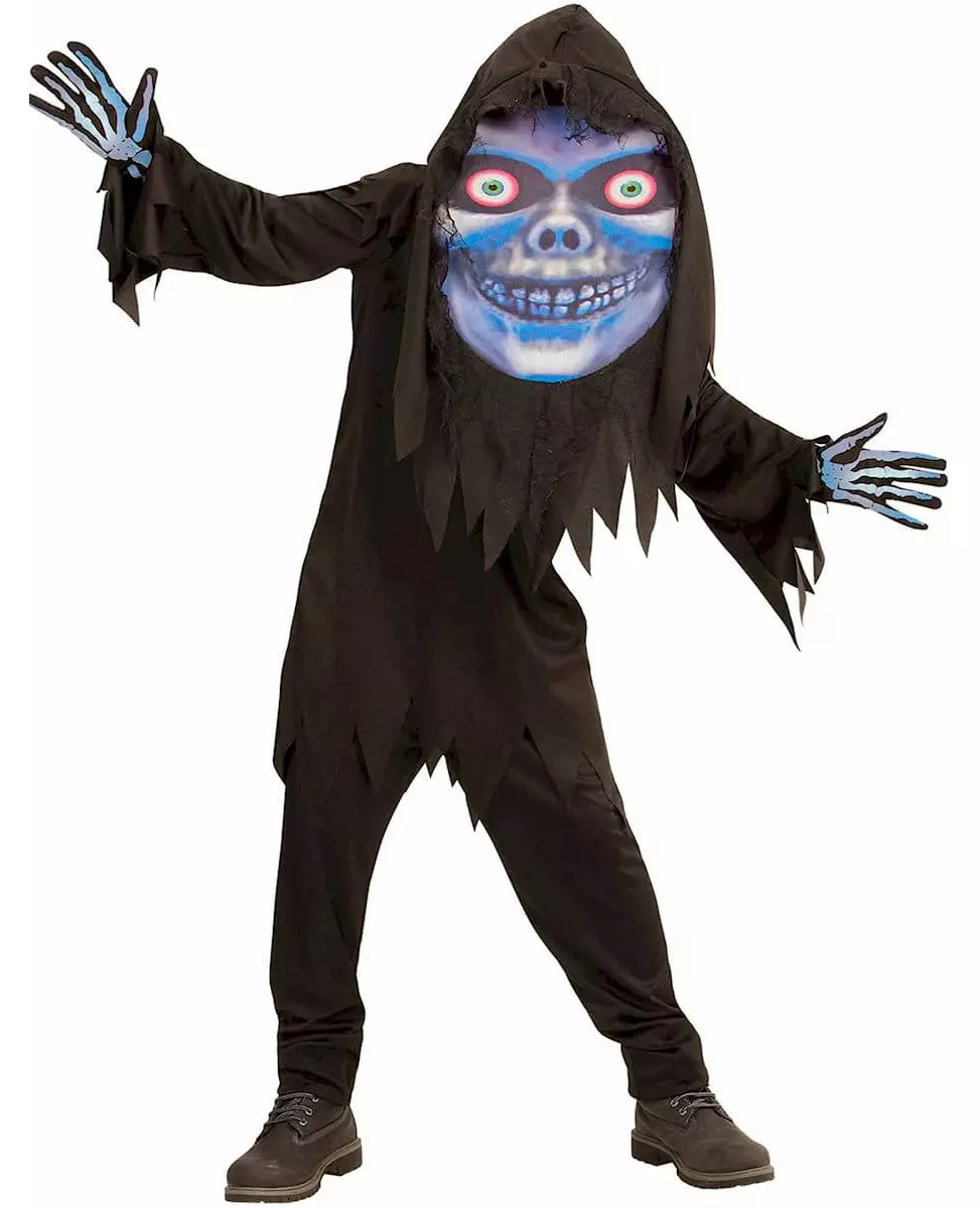 As intriguing as it is scary! This grim reaper costume for teenagers consists of a tunic with an oversized head (pants, gloves and shoes not included). The tunic is made of soft black fabric. It is cut into points at the ends for a torn effect. It has a large head representing a skeleton with a broad smile and a very intriguing look. This original costume will be ideal for being original at Halloween! © Copyright Widmann SRL. Accessories included: Tunic with head Material: 100% Polyester Care: Hand wash