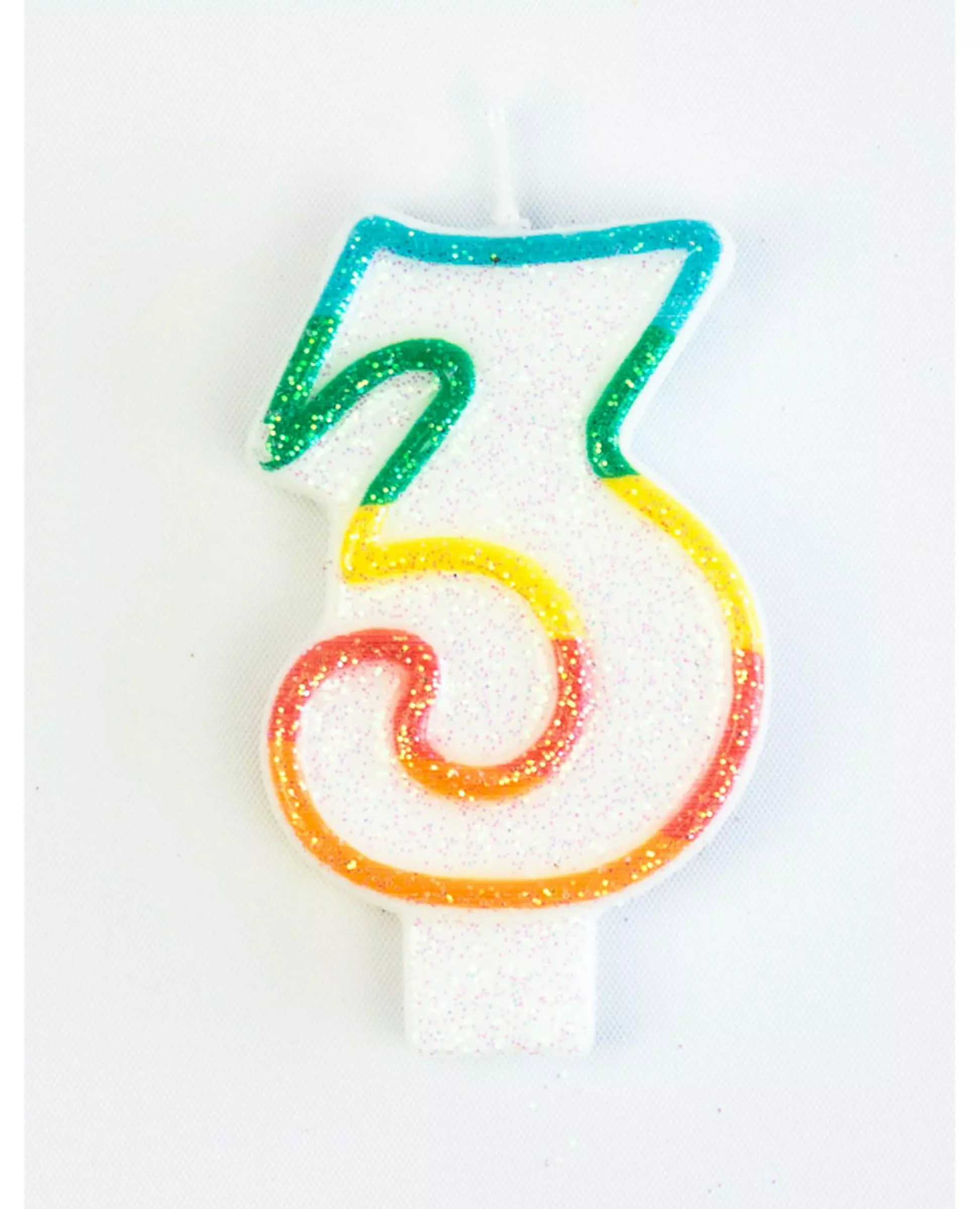 years of happiness! This birthday candle is shaped like the number 3. It measures approximately 7.5 cm. It is made of white wax covered with glitter. A multicolored border is present on the edge of this candle which will be easy to stick on your cake. It will perfectly decorate your birthday cake for your child's 3rd birthday!. Accessories included: Candle Material: Wax