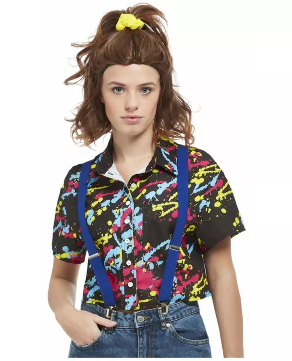Back to the 90s! This 90s shirt is for adults. It has short sleeves and is black. It has a multicolored paint splatter print reminiscent of the 90s. This vintage shirt will be perfect for your 90s-themed party!. Accessories included: Shirt Material: 100% polyester