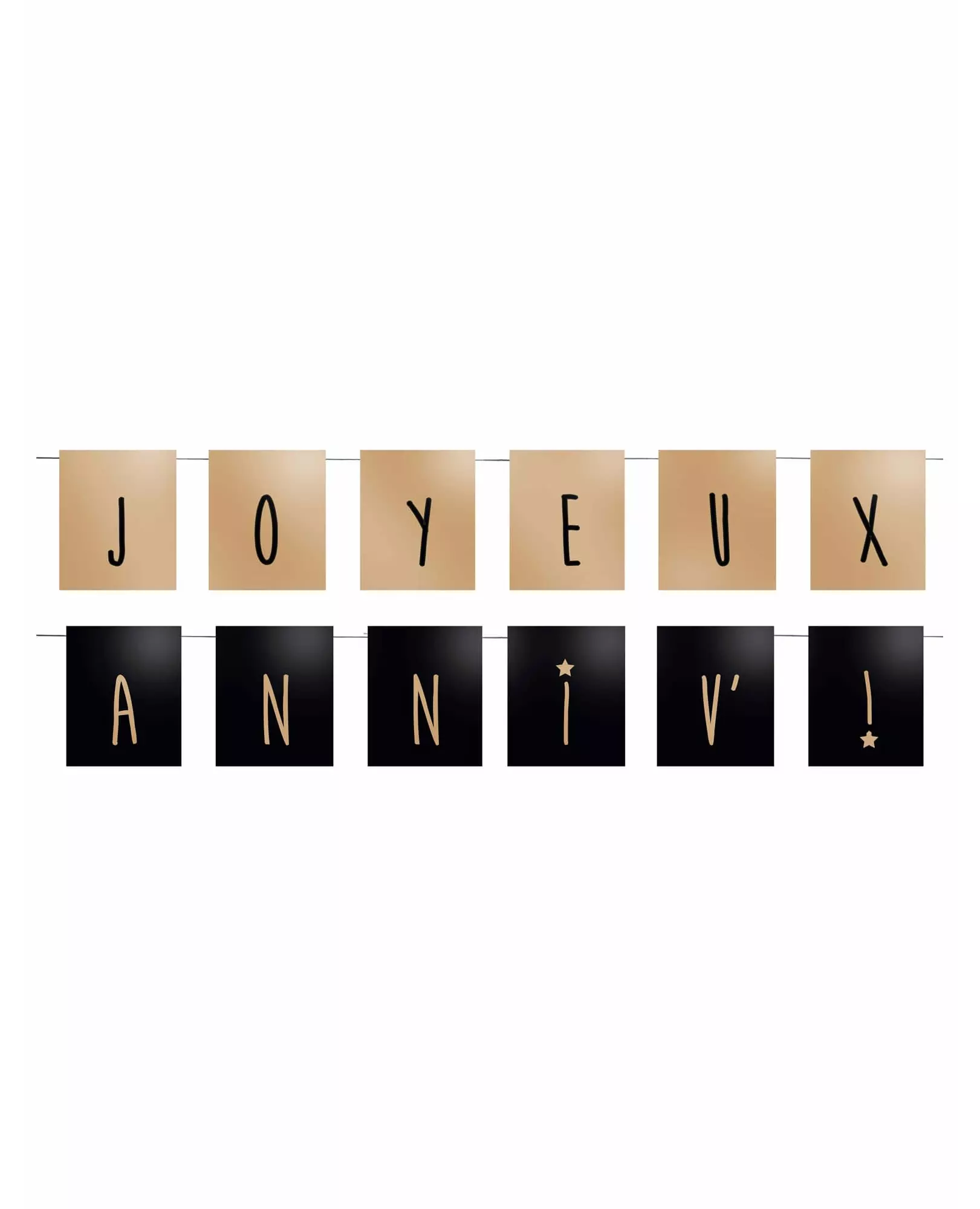 For a chic birthday! This set consists of 2 bunting garlands. Each garland is made up of a cord on which rectangular cardstock pennants are hung. The garlands each measure 120 cm in length, and the pennants measure 7.5 x 9.5 cm. On the first garland, the pennants form the message "Happy" on a gold background. On the second, the pennants form the word "Anniv!" on a black background. These inscriptions are present on the front and back of the pennants. These garlands will be perfect for decorating your reception room. for a birthday party. Accessories included: 2 Garlands Material: Paper