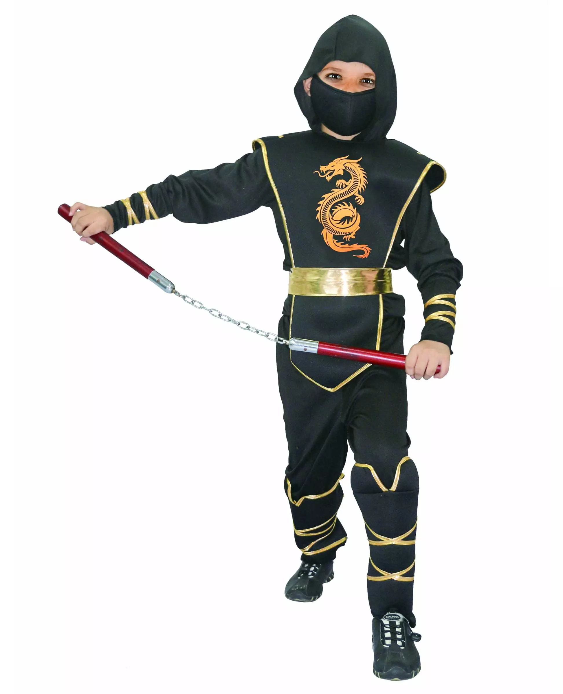A super realistic costume! This ninja costume for boys includes pants, a hooded top, a chest protector, sleeves, leg guards, a belt and a mask. The top and pants are made of comfortable black soft fabric. The chest protector is made of soft foam and will be held to the bust by a golden belt. The sleeves and leg guards are matched with a yellow dragon print. The complete ninja costume will be ideal for your little ninja in training at the Carnival or for a birthday party. Accessories included: Hooded top Armor Pants Mask Belt Sleeves Leg guards Material: 100% polyester Care: Hand wash