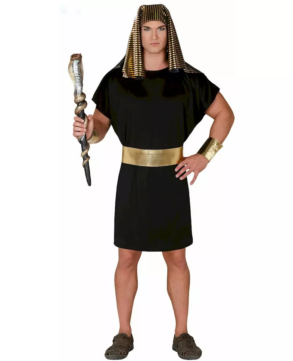 Transform yourself into the lord of the Nile with this black and gold pharaoh costume for men! This pharaoh costume for men includes the headdress, tunic, belt and wristbands (scepter and shoes not included). The short-sleeved tunic is entirely black and reaches the knees, then add accessories like the gold belt and bracelets as well as the black and gold striped headdress! With this outfit you will definitely be the new protector of the Nile, perfect for a pharaoh evening or for Canaval!. Accessories included: Headdress Bracelets Tunic Belt Material: 100% polyester
