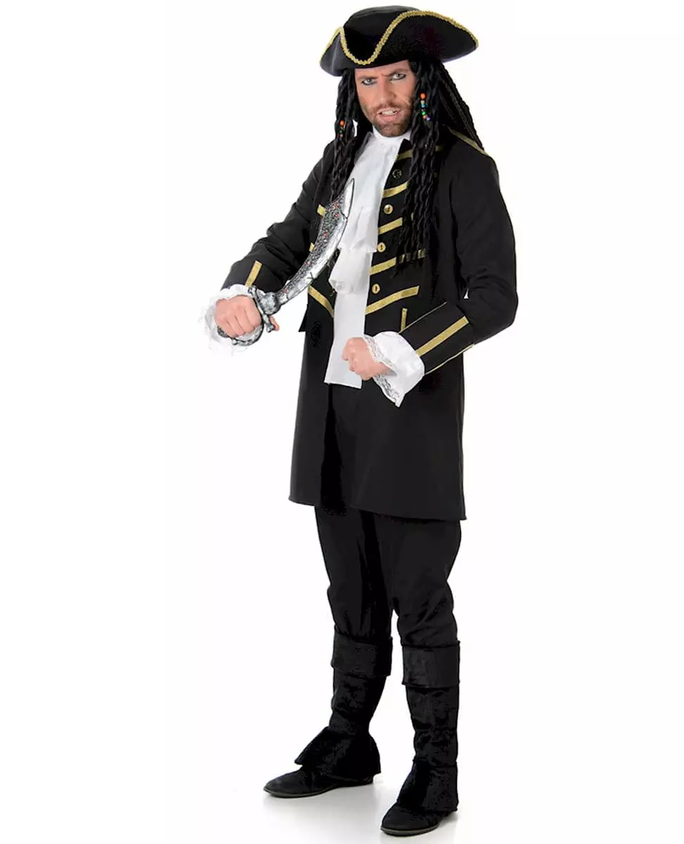 Transform into a very chic pirate This pirate costume for men consists of a jacket, a jabot, a hat, and boot covers (top, sword, pants, and shoes not included). The long jacket is black and gold. It has gold plastic buttons in the middle. White lace is present at the cuffs. The jabot is made of white ruffles. It closes at the neck with Velcro. This jabot is long, so it will fall down to the bust. You can tie it at the waist so that it stays flat. The tricorn hat is black with a gold border. Dreadlock braids are attached to this hat. Finally, the boot covers are black in a velvet-effect fabric. They are held under the feet by elastics. This complete costume will be perfect to be the most chic pirate of the seas. Accessories included: Jabot jacket Hat with braids Overshoes Material: 100% Polyester Care: Hand wash Measurement information: For size L, jacket approximately 92 cm long