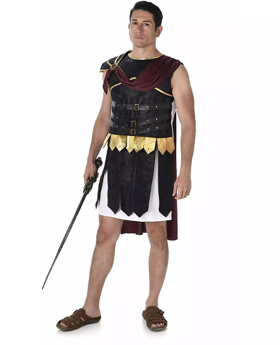 Step into the shoes of a Roman centurion in the service of Caesar. This Roman gladiator costume for men consists of a tunic with a cape. The tunic is plain white. On the front, it is black and gold, with fringes at the bottom. Faux leather ties are also present on the front. They close with metal buckles and are adjustable. A cape is sewn directly to the shoulders. This centurion costume will be perfect for attending a Peplum party. Accessories included: Tunic with cape Material: 100% Polyester Care: Hand wash Measurement information: For size M, tunic is approximately 92 cm long