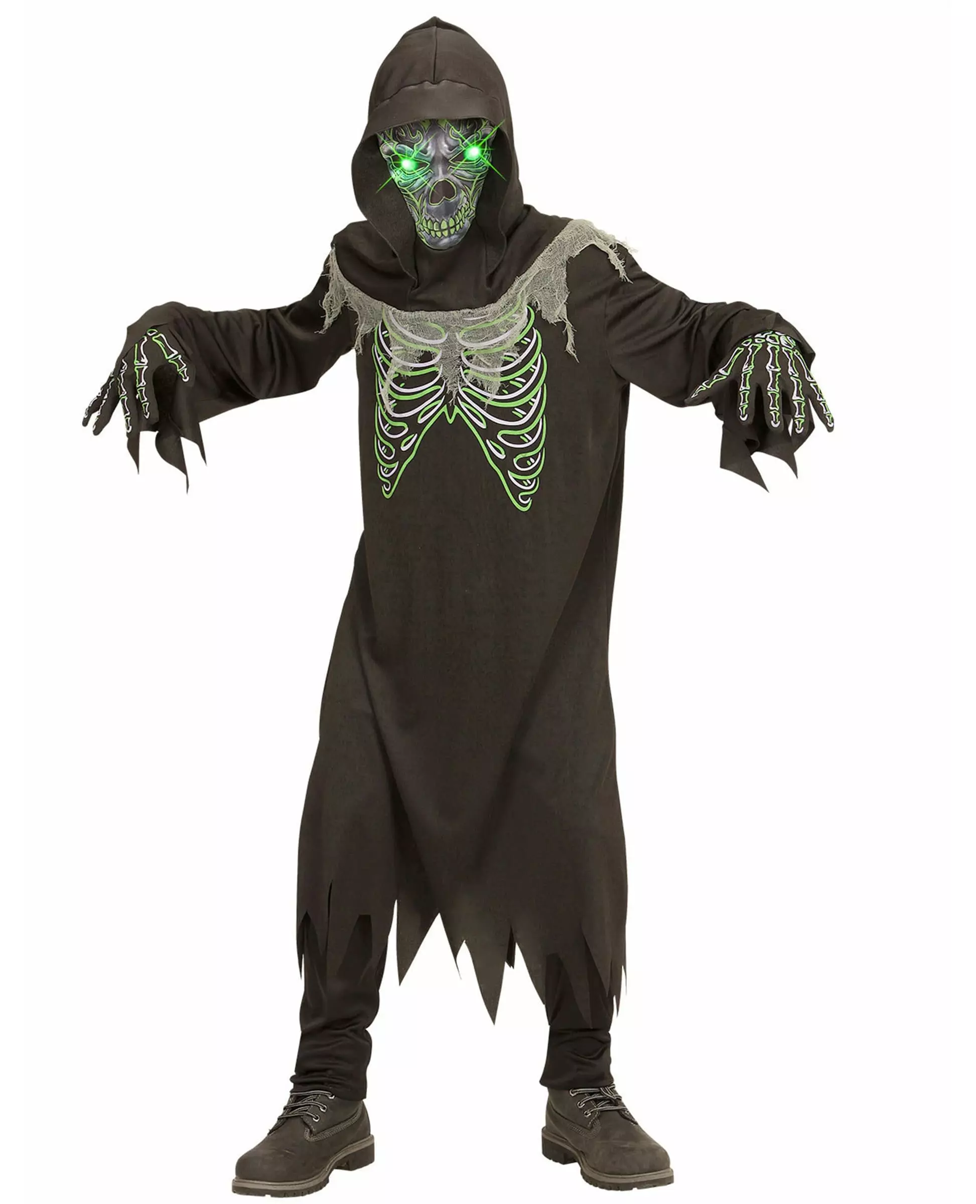 Embody the black and green grim reaper for one night! This black and green grim reaper costume is for children, it consists of a tunic, gloves and a mask with light-up eyes. The tunic is black with long flared sleeves, it is cut into points at the ends. A white and green ribcage is printed on the front of the tunic. A gray veil in points is present on the top of the tunic. The gloves are black with white and green skeleton hand prints on them. The mask is black with green skeleton features, this mask represents horror even more with the green luminous eyes. This black and green grim reaper costume will be perfect on Halloween night. Accessories included: Tunic 2 gloves Mask with luminous eyes Material: 100% polyester Care: Hand wash