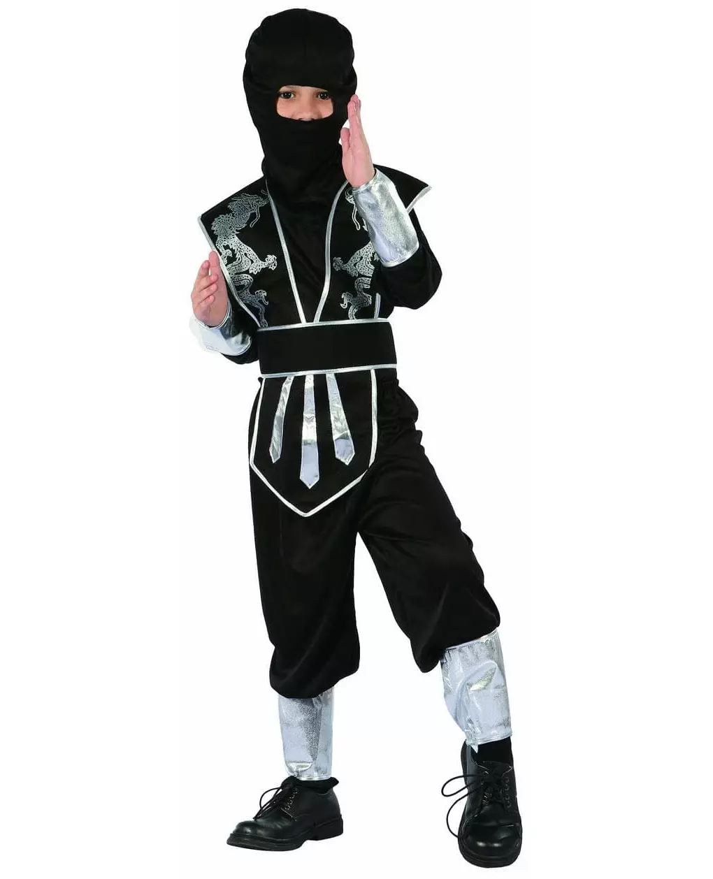 Future Martial Arts Specialist This ninja costume is for boys. It includes a t-shirt, a chest protector, pants, a belt, leggings, sleeves, and a hood. The t-shirt is black and fastens with a Velcro fastener behind the neck. The long sleeves are covered with silver sleeves that attach with Velcro. A more rigid chest protector simulates this Samurai's armor. A silver border follows the contours of the fabric. Two silver dragons are printed on the sides of the chest protector. The loose-fitting black pants have an elastic waistband for a secure fit. The lower legs can be held up by silver velcro leggings. A black belt will be worn over the breastplate and pants, also attached with velcro. The hood is black. It covers the head entirely and leaves the eyes and nose visible. For Carnival or a birthday party, your little boy can show off his ninja skills. Accessories included: T-shirt Breastplate Pants Belt 2 leggings 2 sleeves Hood Material: 100% Polyester Care: Hand wash