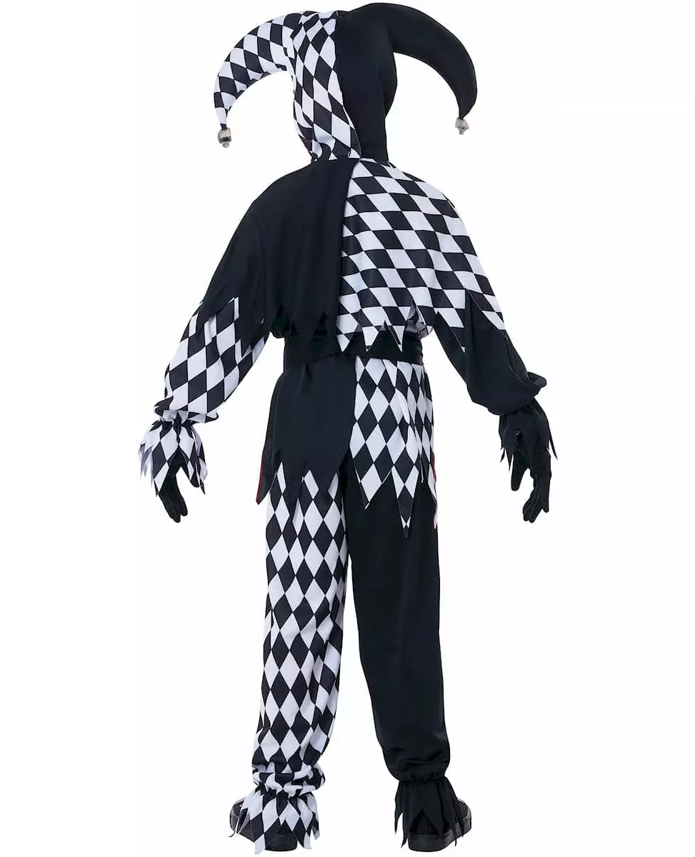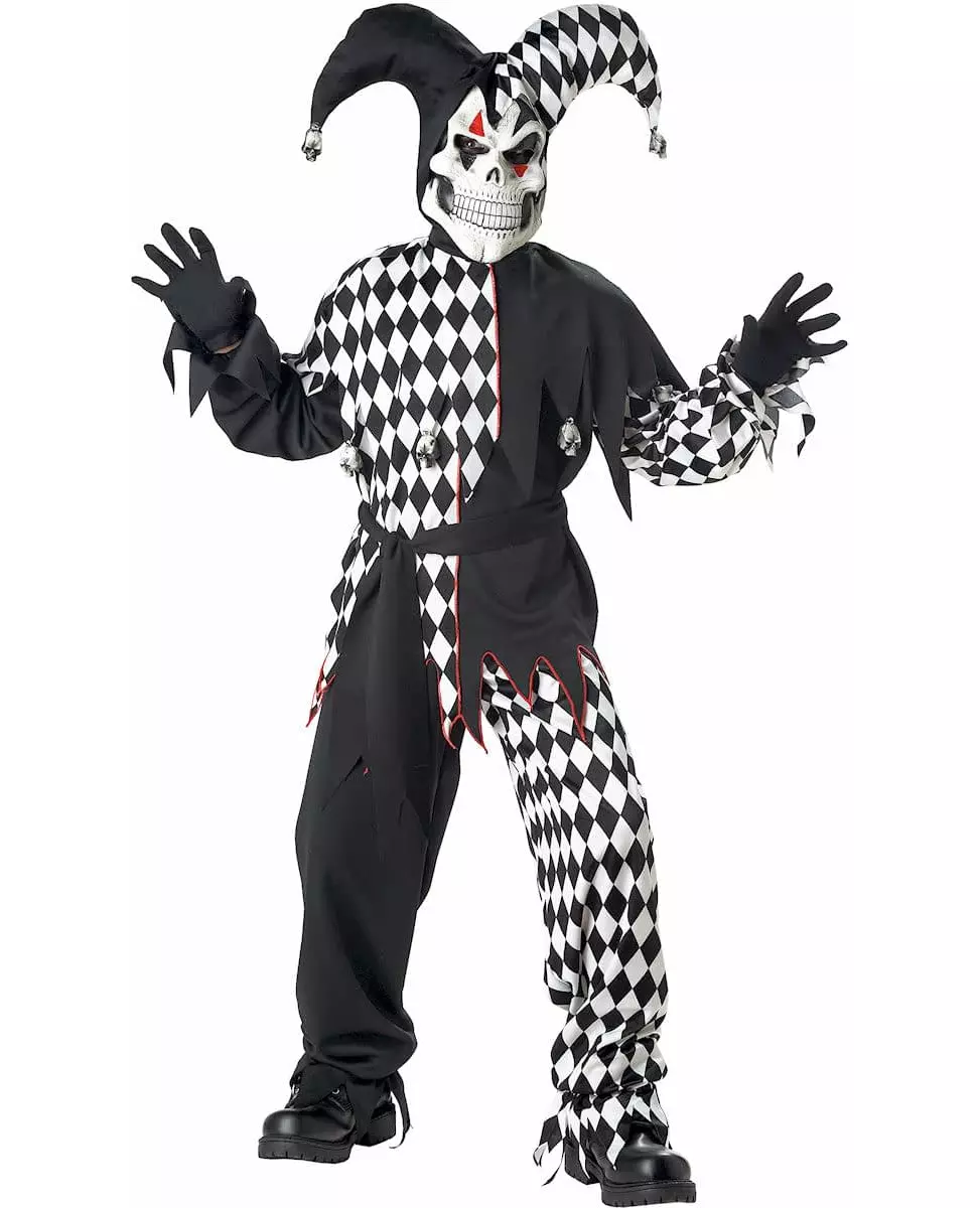 wonderfully scary Joker! This black and white evil Joker costume is for children. It includes a top, pants, a headpiece with a collar, a mask, and a belt. The two-tone black and white top has long sleeves. It is cut into points at the bottom and sleeves. A black belt will tie around your waist. The pants match the top, with an elastic waistband for optimal comfort. The black and white hood will complete the outfit. It has two padded points on the top of the head. It is equipped with a miniature cape on which small skulls are attached. An opening is present at eye level so you can easily see through it during your event. This balaclava is completed with a half mask made of soft plastic. It represents the face of a scary skeleton made up as the Joker. An elastic is present to hold the mask to your face. This complete crazy joker costume will be perfect for changing you into the joker from beyond for Halloween. Accessories included: 1 Top 1 Pants 1 Headdress with collar 1 Mask 1 Belt Material: 100% Polyester Care: Hand wash