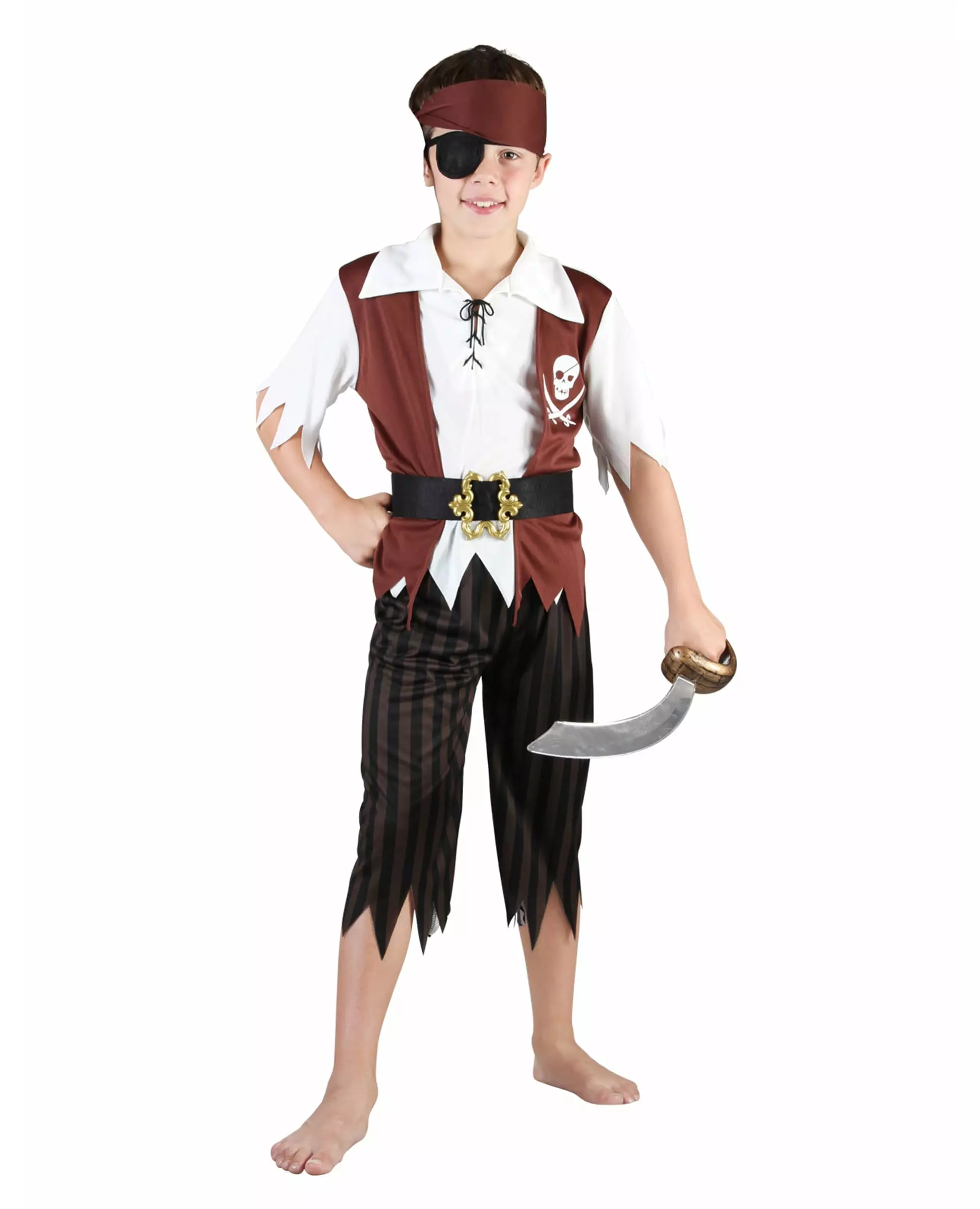 Go on a treasure and jewelry quest in this pirate costume. This pirate costume for boys consists of a top, capri pants, a headband, a belt, and an eye patch. The top is white with short sleeves cut into points. A fake brown vest is sewn only on the front. A small white skull is printed on the chest. A small black lacing is present at the neckline. The striped pants are black and brown. They are cut into points at the bottom and are elasticated at the waist. A black belt with a gold plastic buckle highlights the waist. It closes in the back with a Velcro fastener. A brown headband and a black eye patch accessorize this costume. The eye patch is held to the face with an elastic band. This costume will be perfect for becoming a real corsair at a pirate-themed party or for Carnival. Accessories included: Top Pants Headband Eye patch Belt Material: 100% Polyester Care: Hand wash