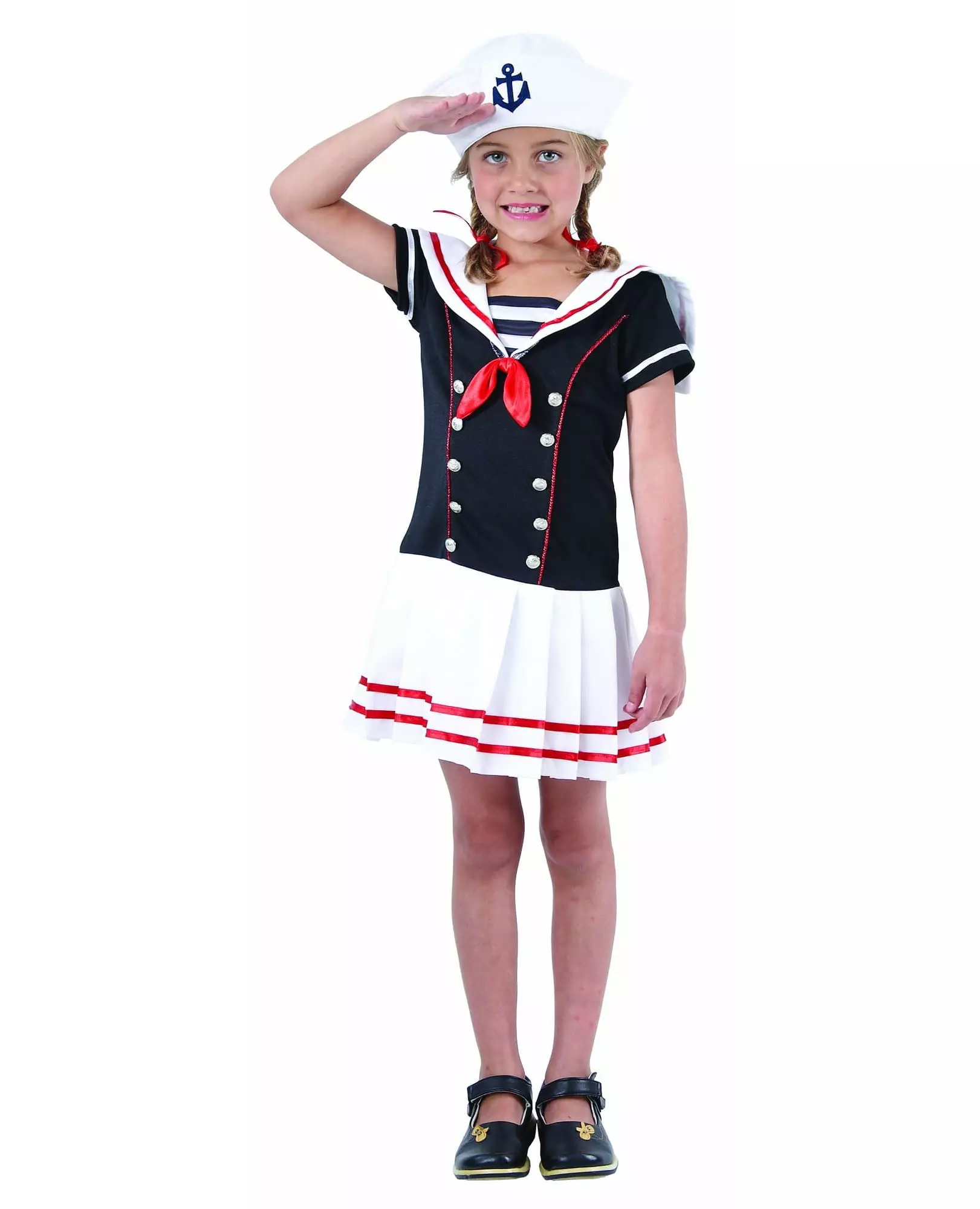 Ahoy, Ahoy Sailor! This sailor costume for girls consists of a dress and a hat (shoes not included). The black and white dress has a sailor collar decorated with red satin ribbons. On the bust, there are 2 rows of 5 silver buttons and shiny red braid. The bottom of the dress, pleated, is decorated with red satin ribbons. The hat is white with black ink on the front. This costume will be perfect for going on a cruise for the occasion of the carnival or for a fancy dress party.. Accessories included: Dress Hat Material: 100% Polyester Care: By hand Measurement information: For size 10/12 years, dress 68 cm long