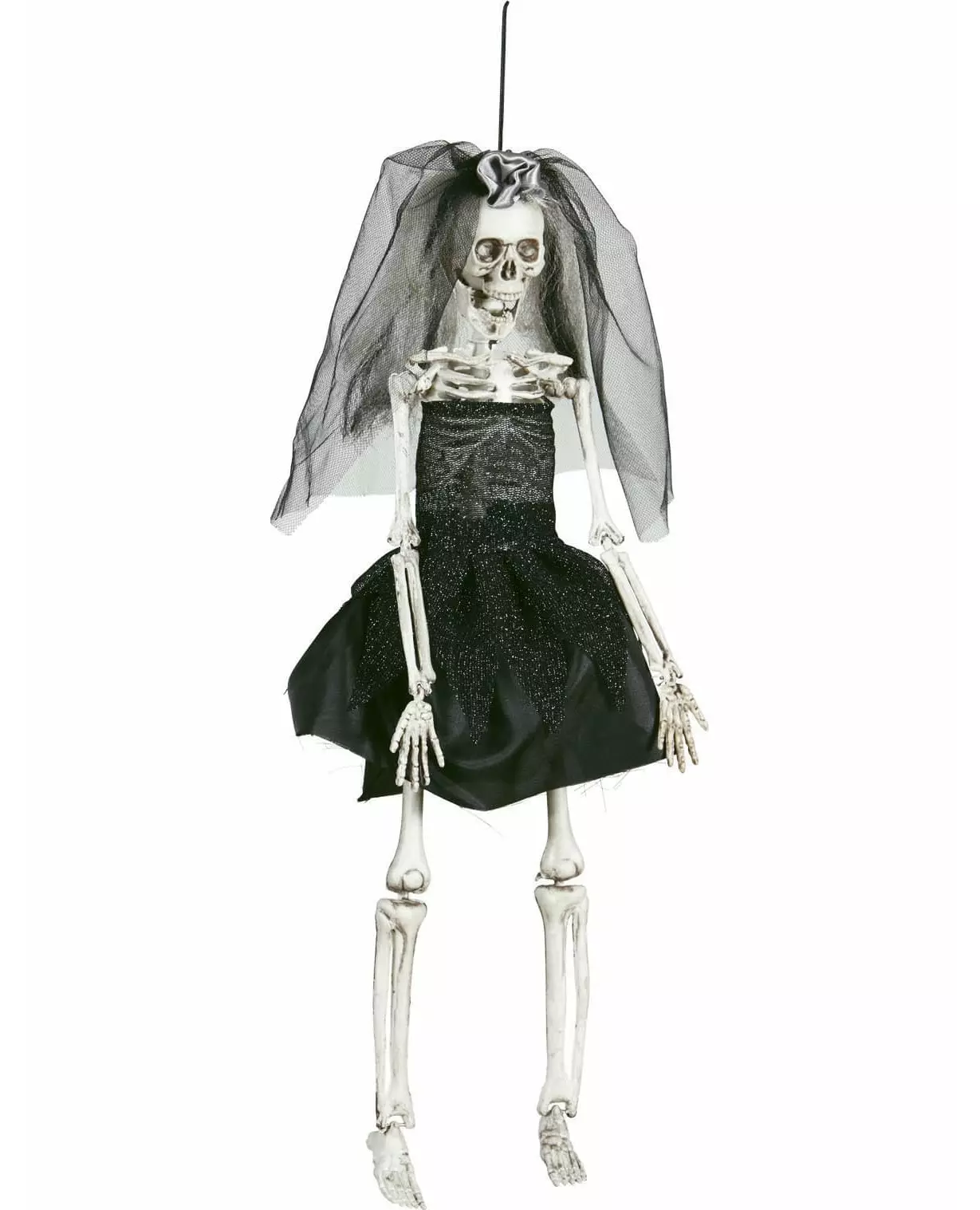 For a macabre decor, opt for the gothic bride This decoration is in the image of a black skeleton bride. It measures approximately 42 cm and will be easily attached thanks to a string fixed to the skull. All joints are articulated. The dress and veil are made of tulle and black satin fabric. This decoration will be perfect for a horror theme during a Halloween evening for example. © Copyright Widmann SRL. Accessories included: Skeleton decoration Material: Plastic