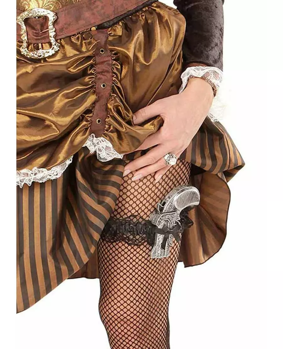 Sexy but dangerous! This women's garter is made of black lace for a chic, glamorous look (stockings not included). This garter comes with an antique gray pistol. This pistol slips into the garter. Opt for a sexy but also dangerous look for theme parties or carnivals thanks to this garter that houses a firearm!. Accessories included: garter with pistol