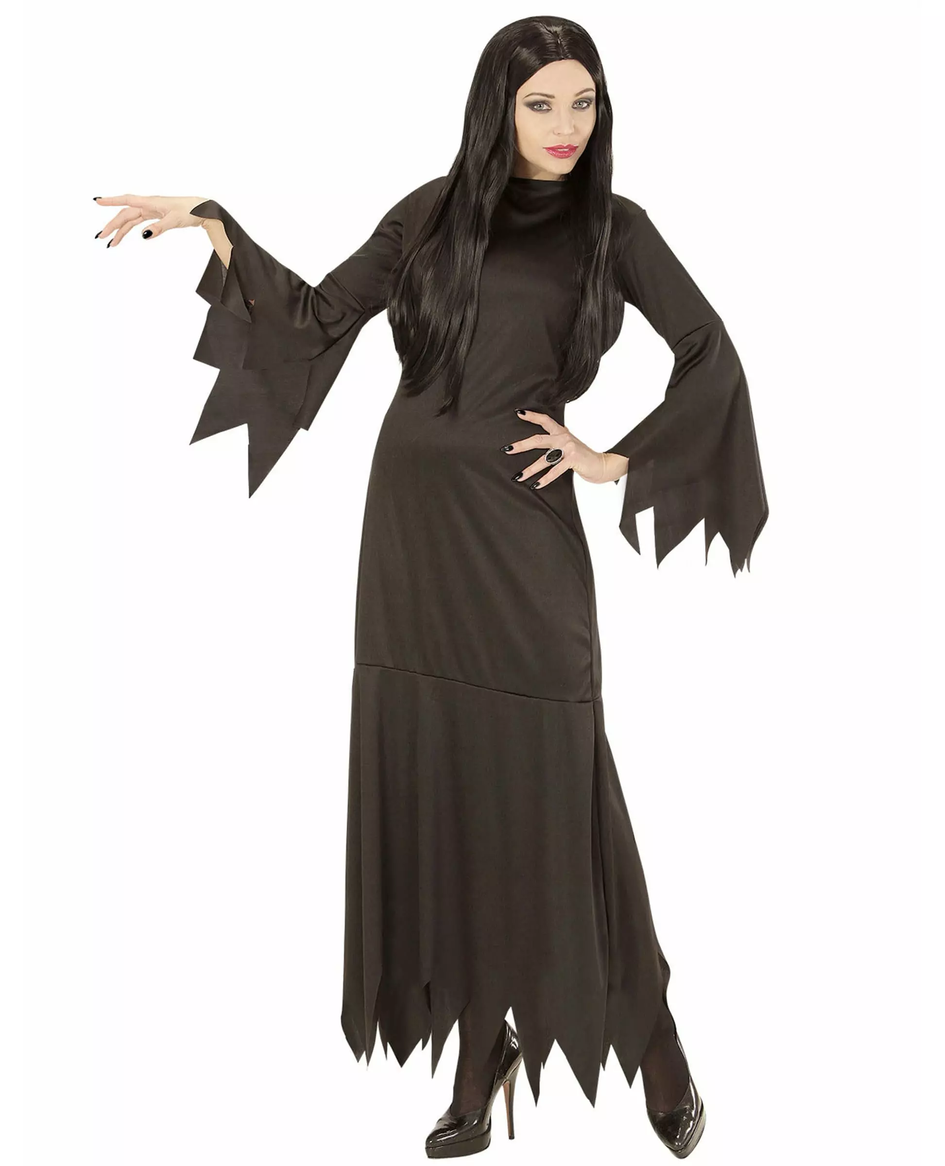 Are you tempted by the gothic look? Fall for this black dress This gothic costume for women consists of a dress (accessories not included). The dress is black with long flared sleeves. Each end of the dress ends in saw teeth. This costume will be simple and effective for a good evening at a costume party. Accessories included: Dress Material: 100% polyester Care: Hand wash