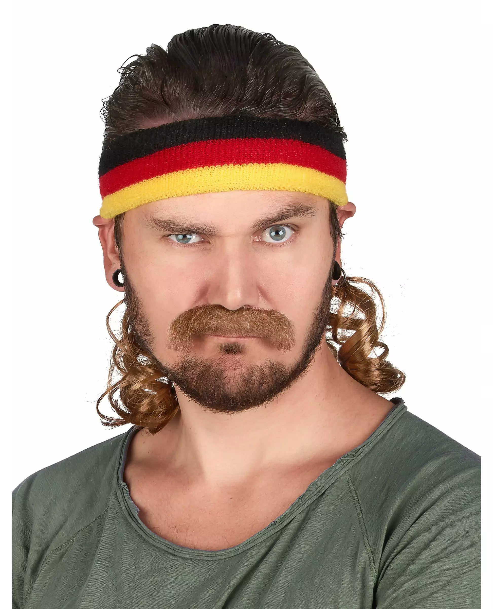 Support your favorite team with humor! This mullet set includes a black, red and yellow headband with curly hair, as well as a mustache in the same color as the hair. This Germany supporter equipment will allow you to wear the colors of your favorite team during a sporting event. Accessories included: 1 Mullet headband with mustache Material: 100% Polyester 100% Polyester