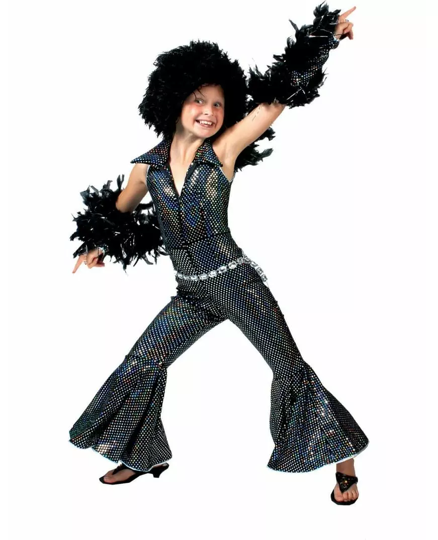 Dance the night away in this disco costume! This black disco costume for girls consists of a jumpsuit (cuffs, boa, belt, and shoes not included). The sleeveless black jumpsuit is decorated with silver sequins that add a shiny touch to the outfit. The bottom of the legs is flared and is lined with a silver border. This jumpsuit closes at the front with a long black zipper. This costume will be perfect for becoming the queen of the night at a disco party or Carnival. Accessories included: Jumpsuit Material: 100% Polyester Care: Hand wash