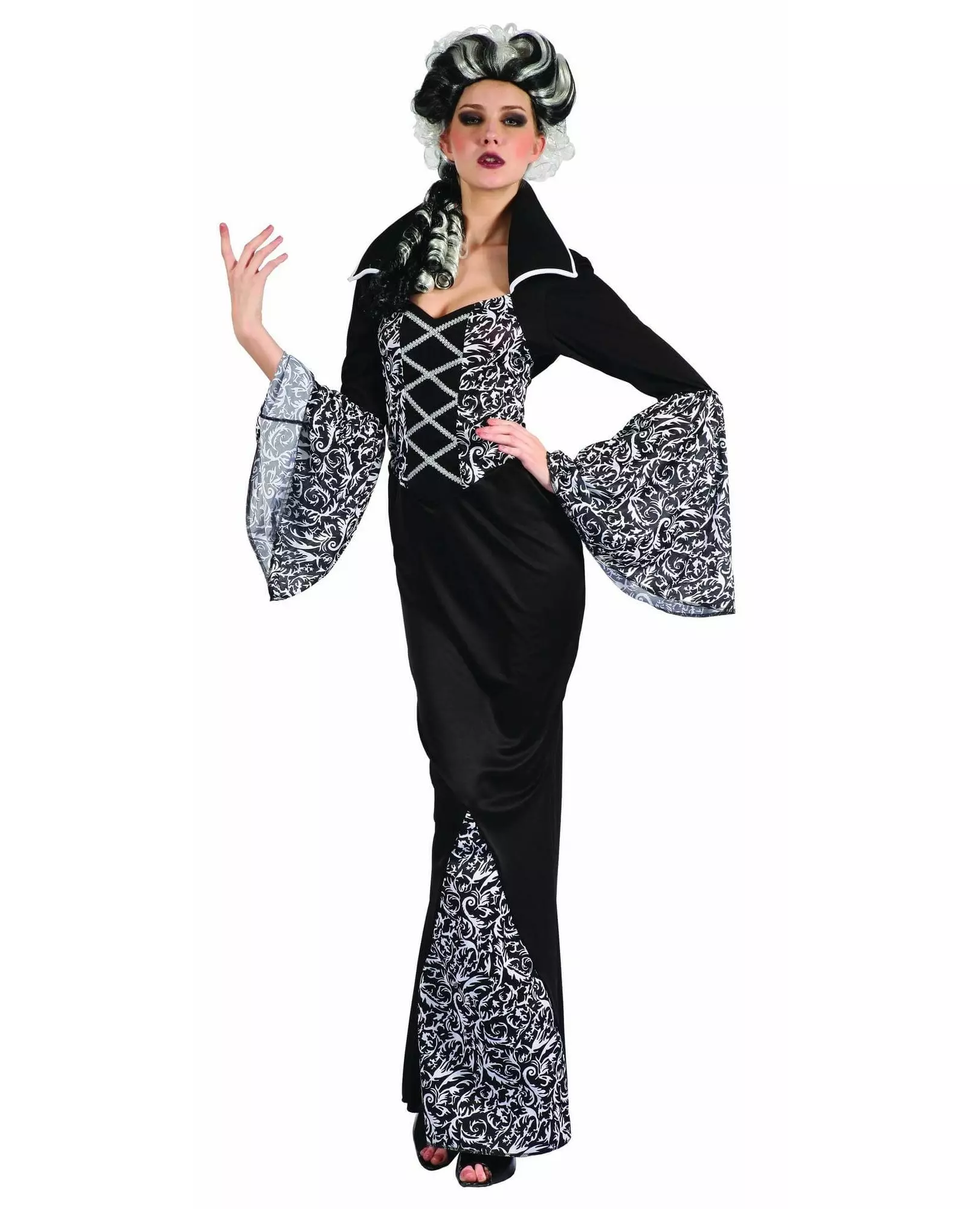 Reveal your gothic side in this elegant vampire costume. This women's vampire costume consists of a dress with a collar (jewelry and shoes not included). The long dress has flared sleeves. The bust, sleeves, and bottom of the dress are decorated with black fabric with white patterns. A silver faux lacing is present at the bust. The bottom of the dress is tightened and will highlight your curves. The collar sewn to the dress is black with a white line on the edges. This costume will be perfect for embodying a gothic vampire. for a horror-themed party or to celebrate Halloween. Accessories included: Dress with a collar Material: 100% Polyester Care: Hand wash Measurements: Dress approximately 158 cm long