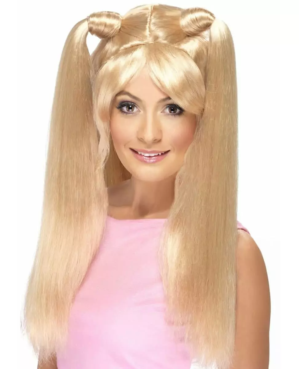 With pigtails! This girl band wig for women is blonde. The hair is straight and has two pigtails on each side tied with a strand. This wig will be perfect to complete your girl band outfit during your costume or theme parties. Material: 100% Polyethylene 100% Polyethylene