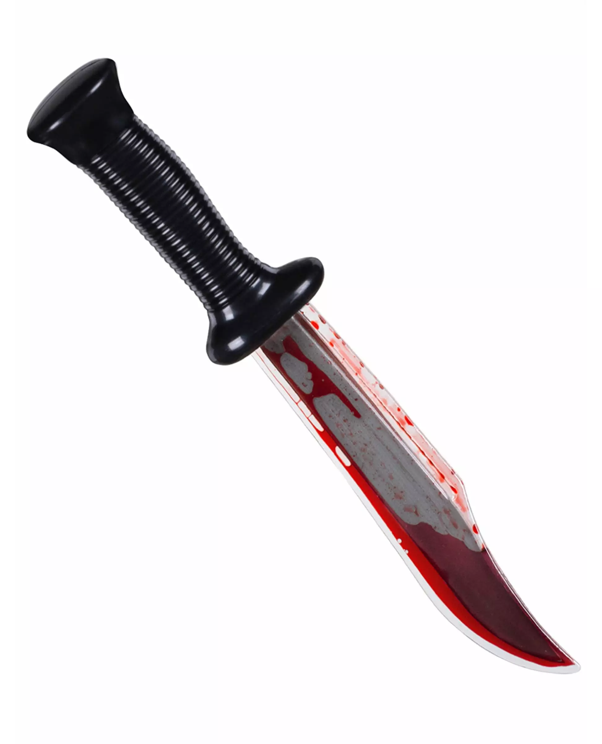 Bloody Assassin Knife 33 cm Need a knife on Halloween night? This bloody assassin knife measures 33 cm, with a black handle and a white blade partially covered in fake blood. The blood inside the blade will move according to your movements.