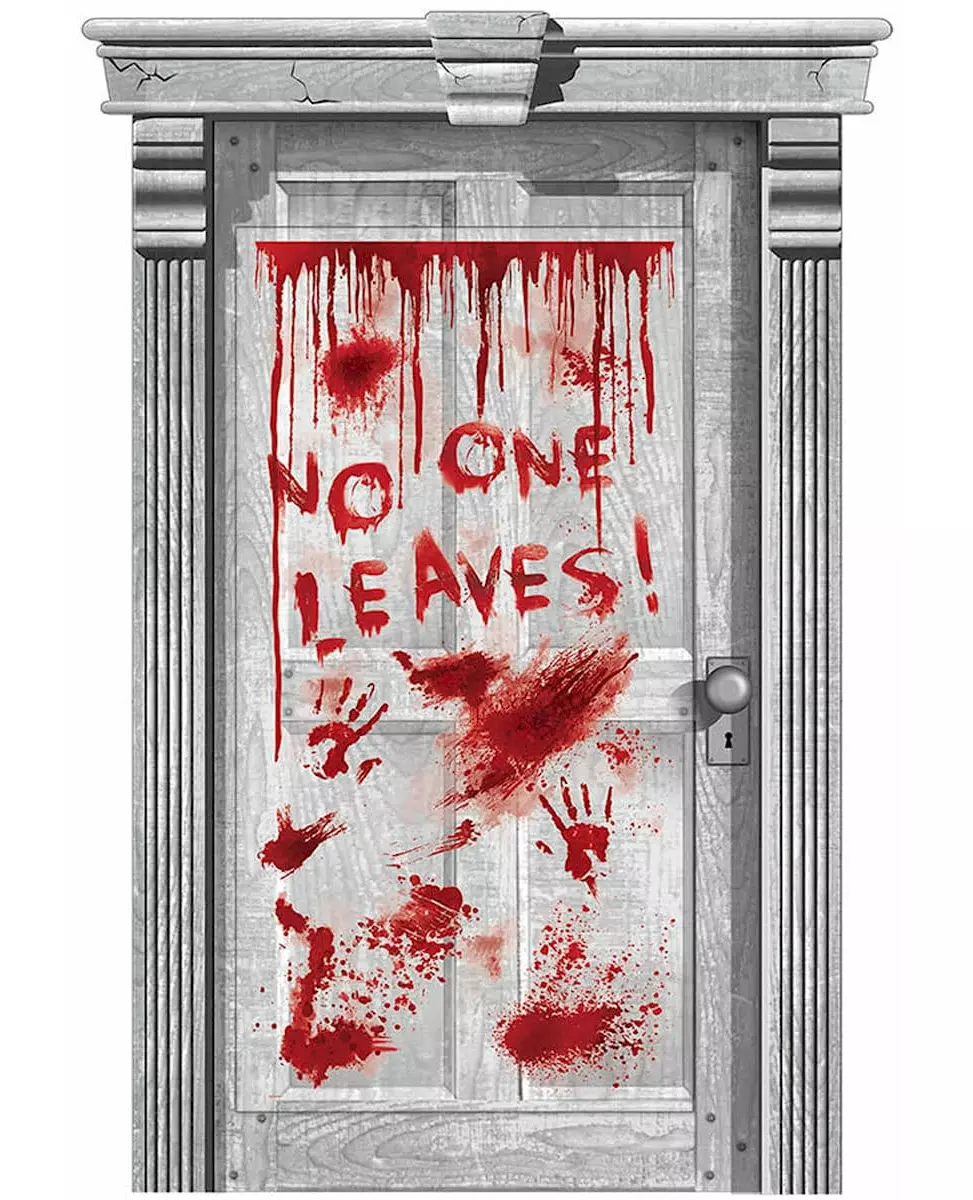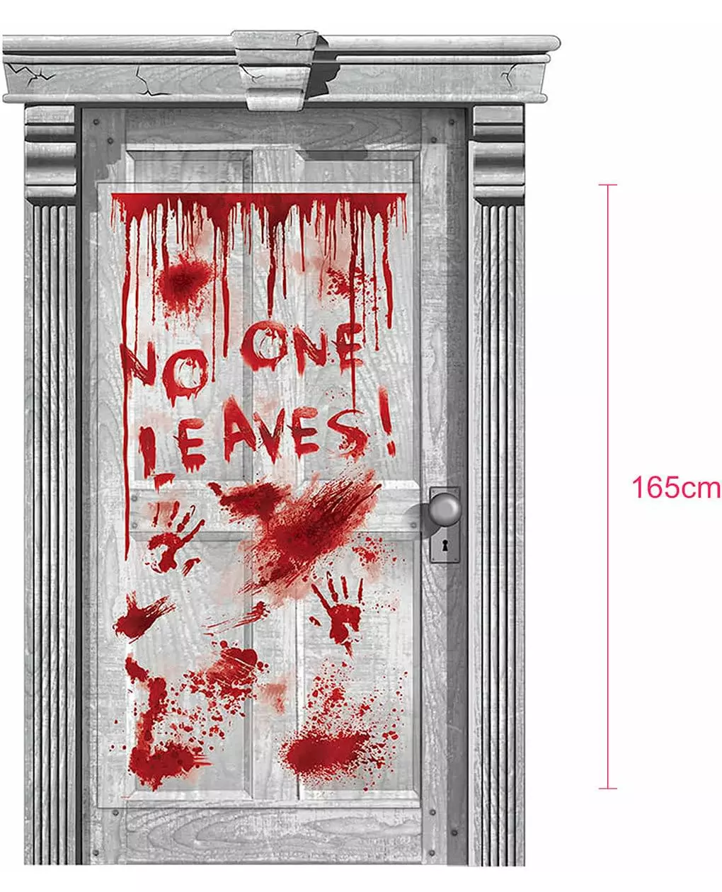No one will leave! This set consists of a plastic film door decoration. This decoration measures approximately 165 x 85 cm. It is semi-transparent and has prints of blood stains, hands, and the words "No one leaves!" You can easily hang it with adhesive tape or pins. Your guests will not dare to go through this door and will be terrified at the idea of entering your room on Halloween! Accessories included: 1 Door decoration Material: Plastic