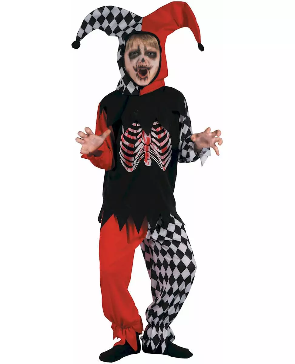 When the harlequin is no longer funny... This bloody harlequin costume is for boys. It consists of a top, pants and a hood. The top is black and red, with a bloody skeleton print on the front. One sleeve has black and white diamonds and the other sleeve is red. It closes with a Velcro fastener behind the top. The pants are red and black and white. The hood matches the pants, it closes with a Velcro fastener under the chin. This bloody harlequin costume will be perfect for your Halloween party. Accessories included: Top Pants Hat Material: 100% polyester Measurement information: For size 4/6 years, the pants measure approximately 68cm. The top measures approximately 47 cm.