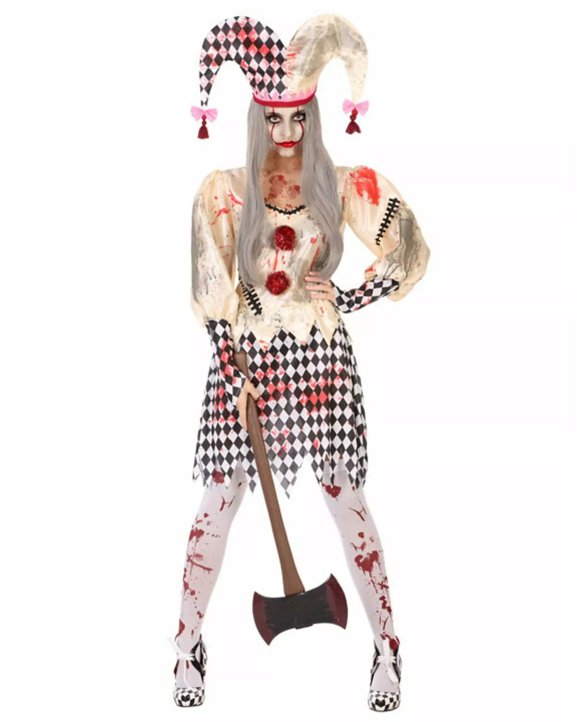 harlequin to make you shudder! This bloody Harlequin costume for women contains a dress and a hat (tights, axe and shoes not included). The short, pointed dress with long sleeves is two-tone. The top of this dress is off-white, decorated with blood-red pompoms and coarse black stitching. The off-white puffed sleeves end in a form-fitting black and white diamond fabric. The bottom of this dress matches the ends of the sleeves and is cut into points for a torn look. And for an even more frightening look, this dress is covered in blood stains! The Harlequin hat is also two-tone. One side is off-white and the other is black and white diamonds. The whole thing is highlighted with a pink border and bows as well as a blood red border and pompoms. This bloody Harlequin costume will be ideal for embodying a crazy character on Halloween night. Accessories included: Hat Dress Material: Polyester Care: Hand wash