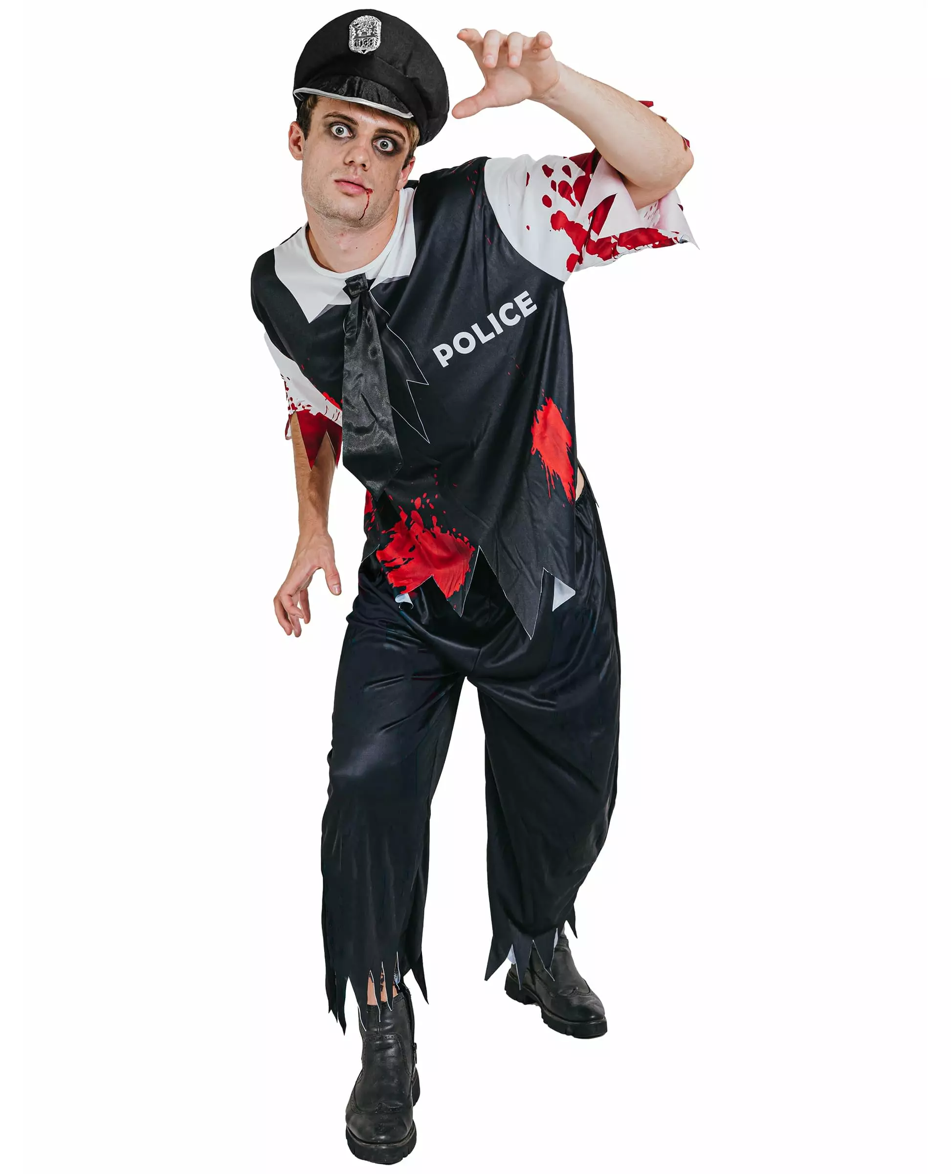 Bloody! This Halloween zombie policeman costume for men consists of a white short-sleeved t-shirt with a black cut-out tie sewn on the top and a matching cap (shoes and bat not included). Matching black pants with an elastic waistband. This costume will be ideal for playing a policeman on Halloween night or other evenings.. Accessories included: -Top -Pants Material: 100% Polyester Care: Hand wash
