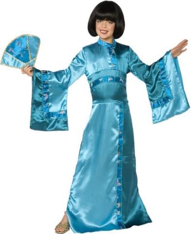 Fan included! This Chinese girl costume consists of a long kimono and a fan (shoes not included). The kimono is blue. It is made of satin, and there are Velcro fasteners at the back for easy use. The sleeves are flared and borders with printed butterflies are sewn to the ends. A matching fan accessorizes this set. The fan is held in place by plastic stays sewn inside. This costume will be ideal for embodying a real little Geisha for Carnival or other fancy dress events. Accessories included: Kimono Fan Material: 100% polyester Care: Hand wash
