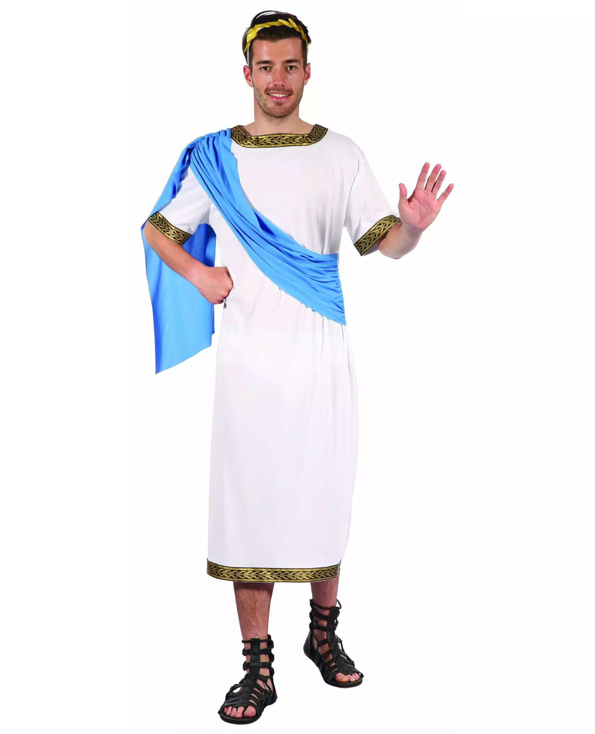 Pretend you're a god and lay down the law for a costume party. This Greek god costume for men consists of a dress and a headdress (shoes not included). The dress is white with short sleeves. The bottom of the dress, sleeves, and neckline are edged with a wide black and gold braid. A blue drape is present at the front of the dress and falls behind the right shoulder. This dress closes in the back with two ties. Finally, a headdress representing a gold-colored laurel wreath completes this costume. This is a white plastic headband with fake golden bay leaves on it. This costume will be perfect for putting yourself in the shoes of a Greek god for a mythology-themed party. Accessories included: Dress Headdress Material: 100% Polyester Care: Hand wash