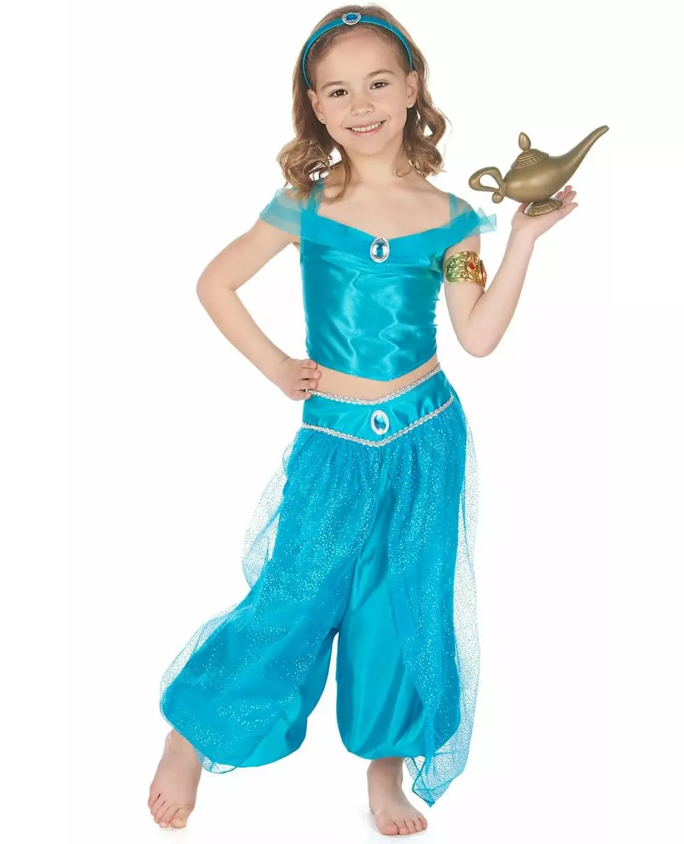 magnificent oriental princess! This oriental princess costume consists of a top, pants, and a headband. The top is entirely blue and has thin straps. A transparent blue veil and a beautiful jewel decorate the collar. The pants are blue with a satin effect and are tightened at the ankles for a puffy effect. It is covered with a transparent blue veil that is sewn at the waist and is decorated with a precious stone. The headband is satin blue and decorated with a jewel. With this costume, your daughter will perfectly embody a magnificent oriental princess. for Carnival or a birthday party!. Accessories included: Top Pants Headband Care: Hand wash