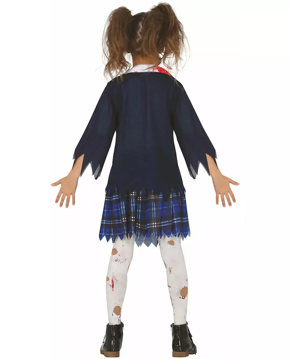 Going back to school hasn't been beneficial! This zombie schoolgirl costume is for children. It consists of a jacket with shirt and tie and a skirt (tights and shoes not included). The jacket is blue and the white shirt is sewn on top of it, just like the blue tie with black stripes found in the middle. The skirt has a blue tartan pattern and gives the illusion of a schoolgirl skirt. The zombie side is found on the ends of the clothes, which look like they're torn, thanks to the fake blood stains on the top. Dare to transform your daughter into a zombie schoolgirl for her Halloween costume party! Material: 100% POLYESTER. Accessories included: Jacket with t-shirt and tie Skirt Care: Hand wash