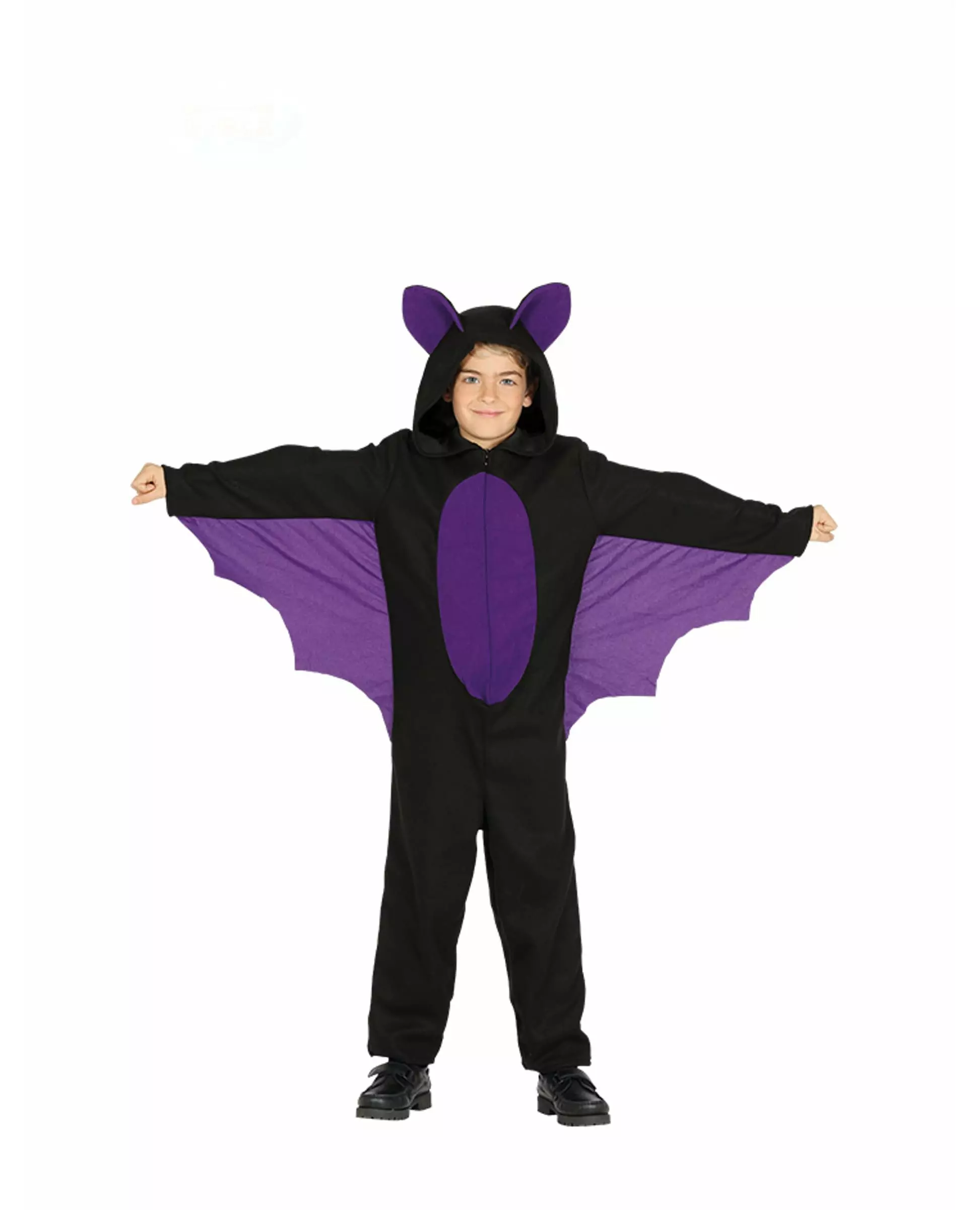 Stay warm in your bat costume This bat costume for children consists of a jumpsuit. This one is black, with a purple belly and wings. It also has a hood, with large purple ears. This costume will be perfect for dressing up while staying warm on Halloween night. Accessories included: Jumpsuit Material: 100% Polyester Care: Hand wash