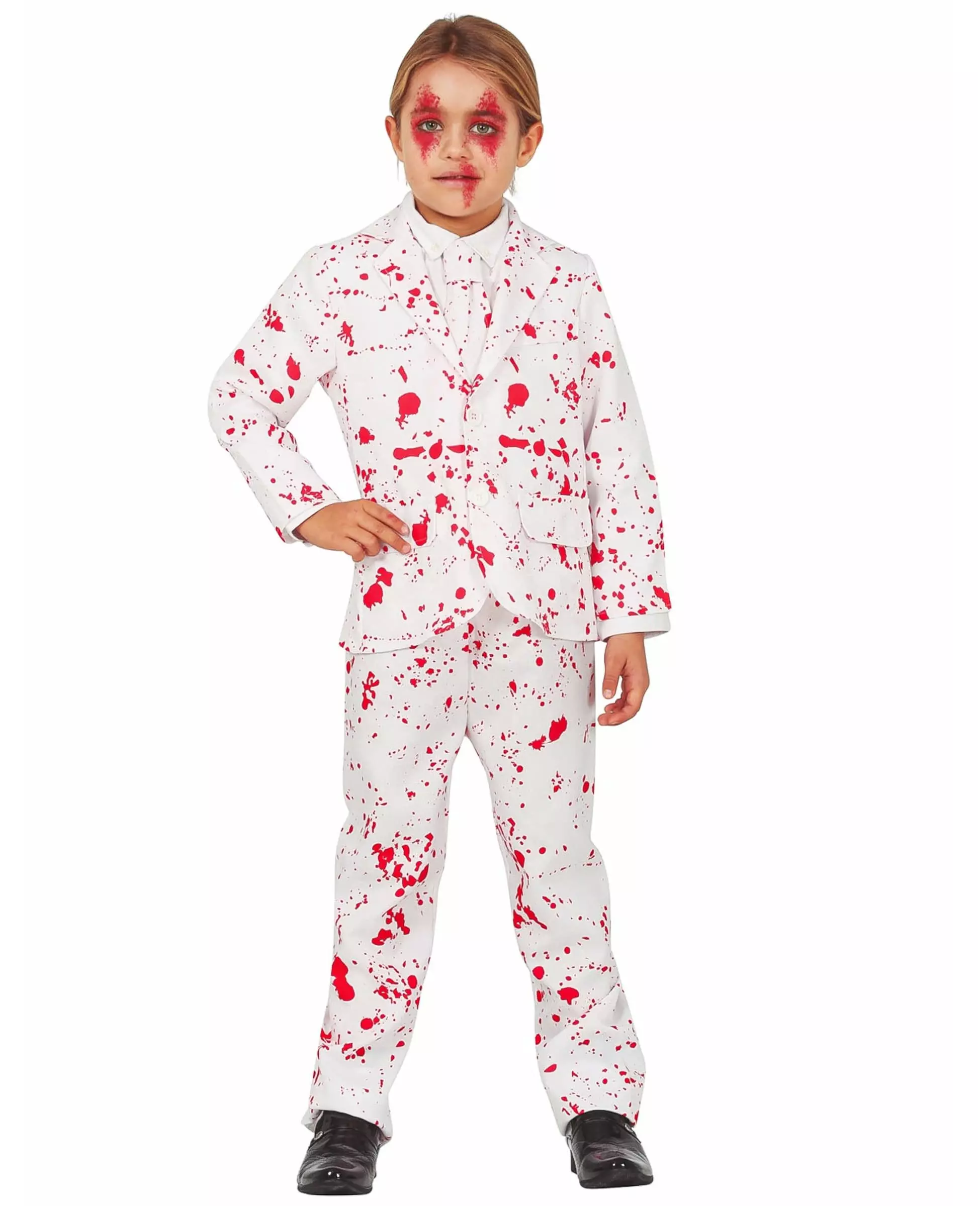 scary wedding! This bloody groom costume is for boys. It consists of a jacket, a tie, and pants. The costume jacket is white with a bloody effect throughout. Two fake pockets are incorporated into the jacket. Easy and practical to wear, the costume jacket fastens with two white buttons on the central part of the jacket. The pants, also white, with their bloody effect, will perfectly complete this costume. Finally, a tie in the same shades as the rest is added. This costume both chic and shocking will follow your child during a Halloween evening! Accessories included: Jacket Tie Pants Material: Polyester Care: Hand wash