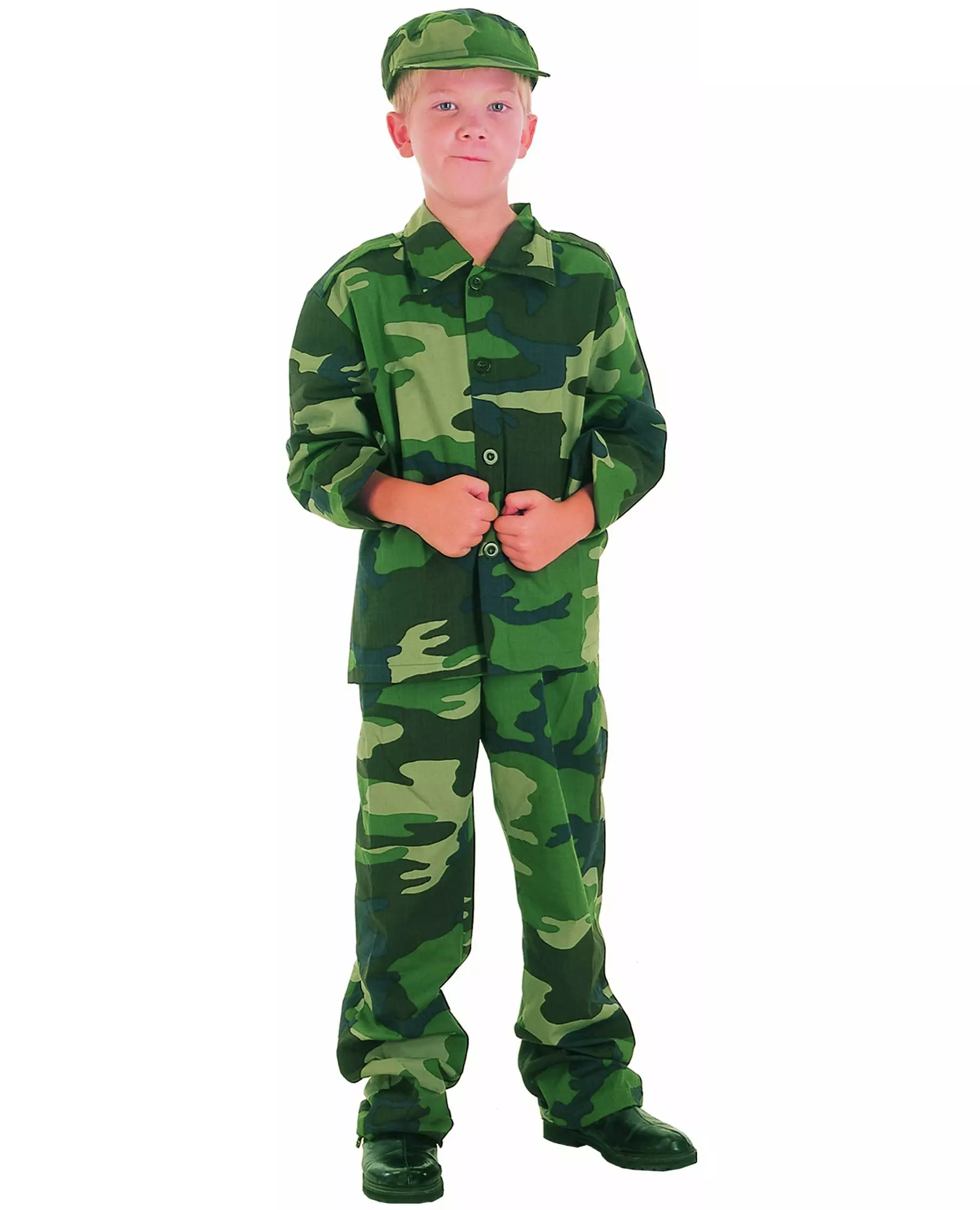 Get ready for battle This boy's military costume consists of a top, pants, and a cap (shoes not included). The long-sleeved top is green with a camouflage print. It has full-length buttons down the front. The camouflage pants and cap complete this soldier costume. This costume will be perfect to prepare you for your next battle at a costume party or Carnival. Accessories included: Top Pants Cap Material: 100% Polyester Care: Hand wash
