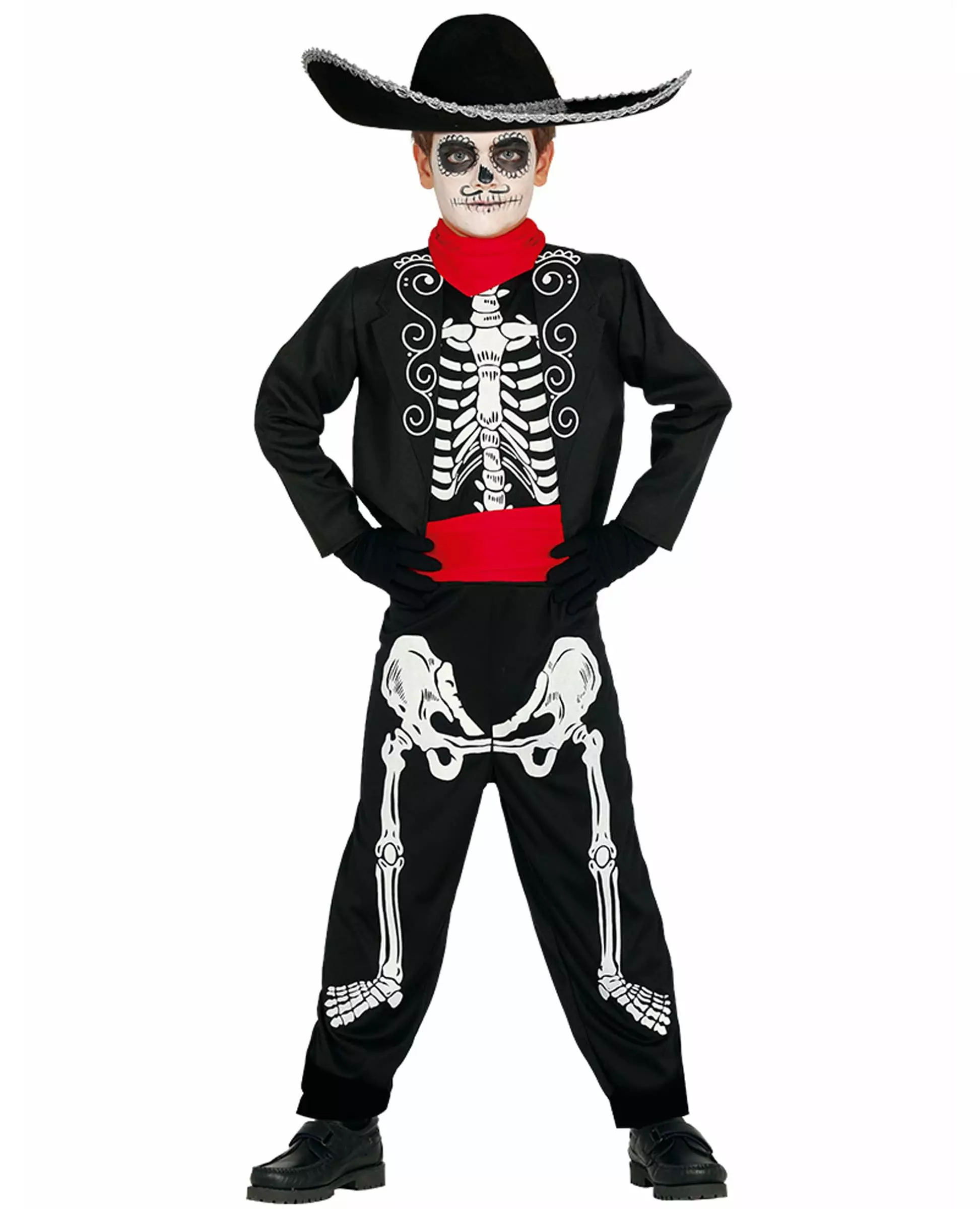 A deadly Mexican! This Dia de los Muertos skeleton costume for boys consists of a bandana, a jumpsuit, a jacket and a belt. The black jumpsuit is printed with a white skeleton. The black jacket is decorated with white prints on the front. The red bandana matches the belt that ties at the waist. Choose this Dia de los Muertos skeleton costume for boys for Halloween. Accessories included: Bandana Jumpsuit Jacket Belt Material: 100% polyester Care: Hand wash