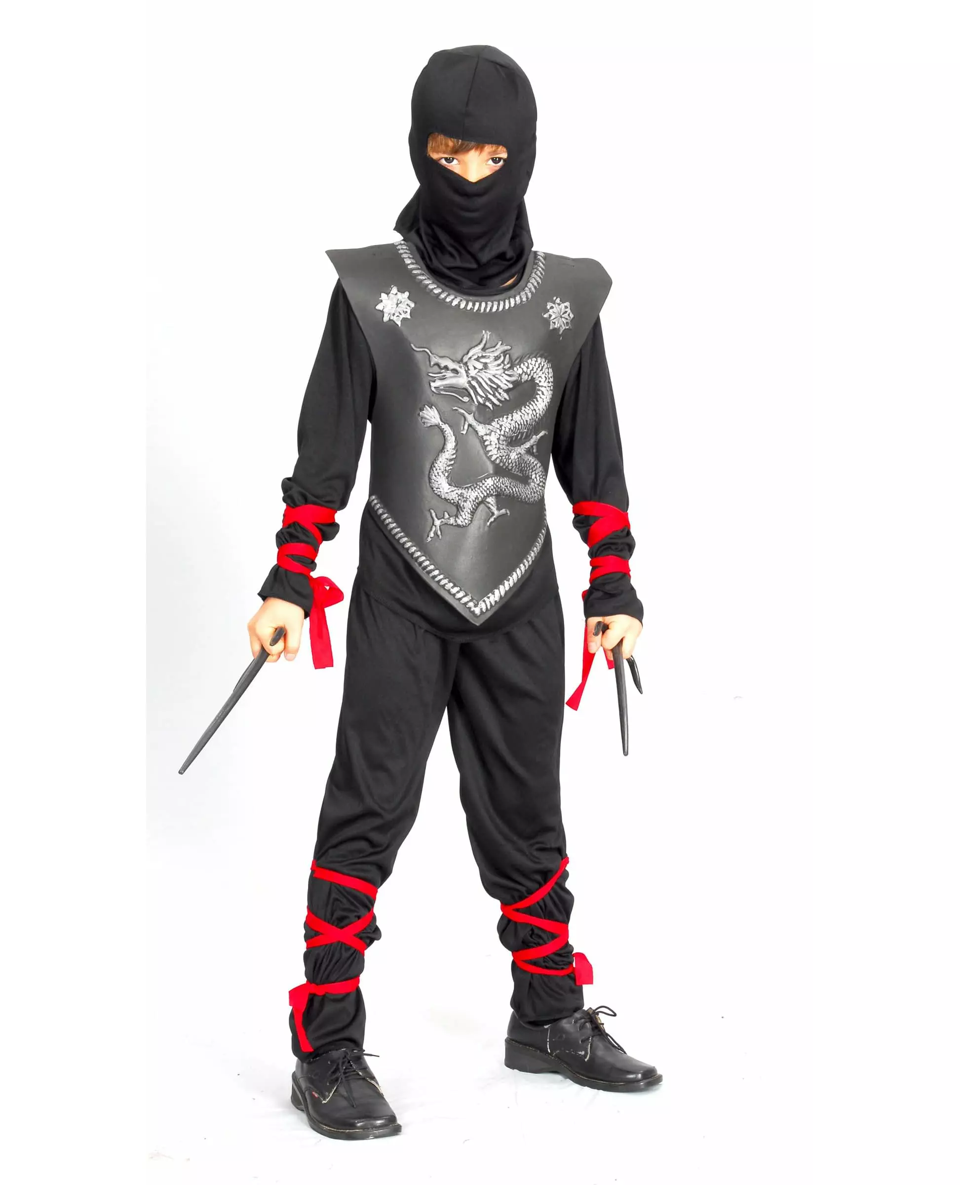 Protective armor included! This dragon ninja costume for boys consists of a hood, a top with a foam chest protector, and black pants with an elastic waist. Red printed ribbons are around your arms and calves (weapons and pants not included). This costume is perfect for playing a real ninja for carnival, a birthday party, or at fancy dress parties. Accessories included: Top with chest protector Hood Pants Material: 100% Polyester Care: Hand washable