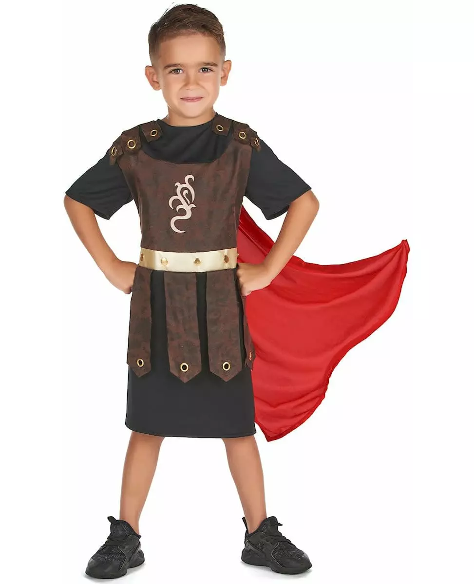 Become a real gladiator! This gladiator warrior costume for boys consists of a tunic and a cape. The tunic is black with brown faux armor and a gold belt. A symbol is printed on the front of the costume. The straps on the skirt and shoulders are decorated with small gold rivets. A red cape will be added to this outfit for a complete gladiator costume! This Roman warrior costume will be perfect for a fancy dress party with an ancient, Roman, or Carnival theme! Accessories included: Tunic Cape Material: Polyester Care: Hand wash