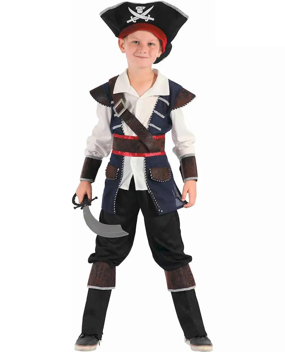 Go in search of pirate treasure This pirate costume for boys consists of a top, pants, and a hat. The top is a white blouse with a dark blue jacket. The shoulders and cuffs are made of brown faux leather. A matching faux belt fastens with Velcro at the waist. This top is solid gray in the back. It is elasticated at the waist and fastens with Velcro at the front. The pants are black with felt overboots from the knees up. It is elasticated at the waist for added comfort. The pirate hat is black with a red band at the bottom and a white skull at the back. front. This pirate costume will be perfect for going on a treasure hunt on Carnival day. Accessories included: Top with belt Pants with overboots Hat Material: 100% Polyester Care: Hand wash