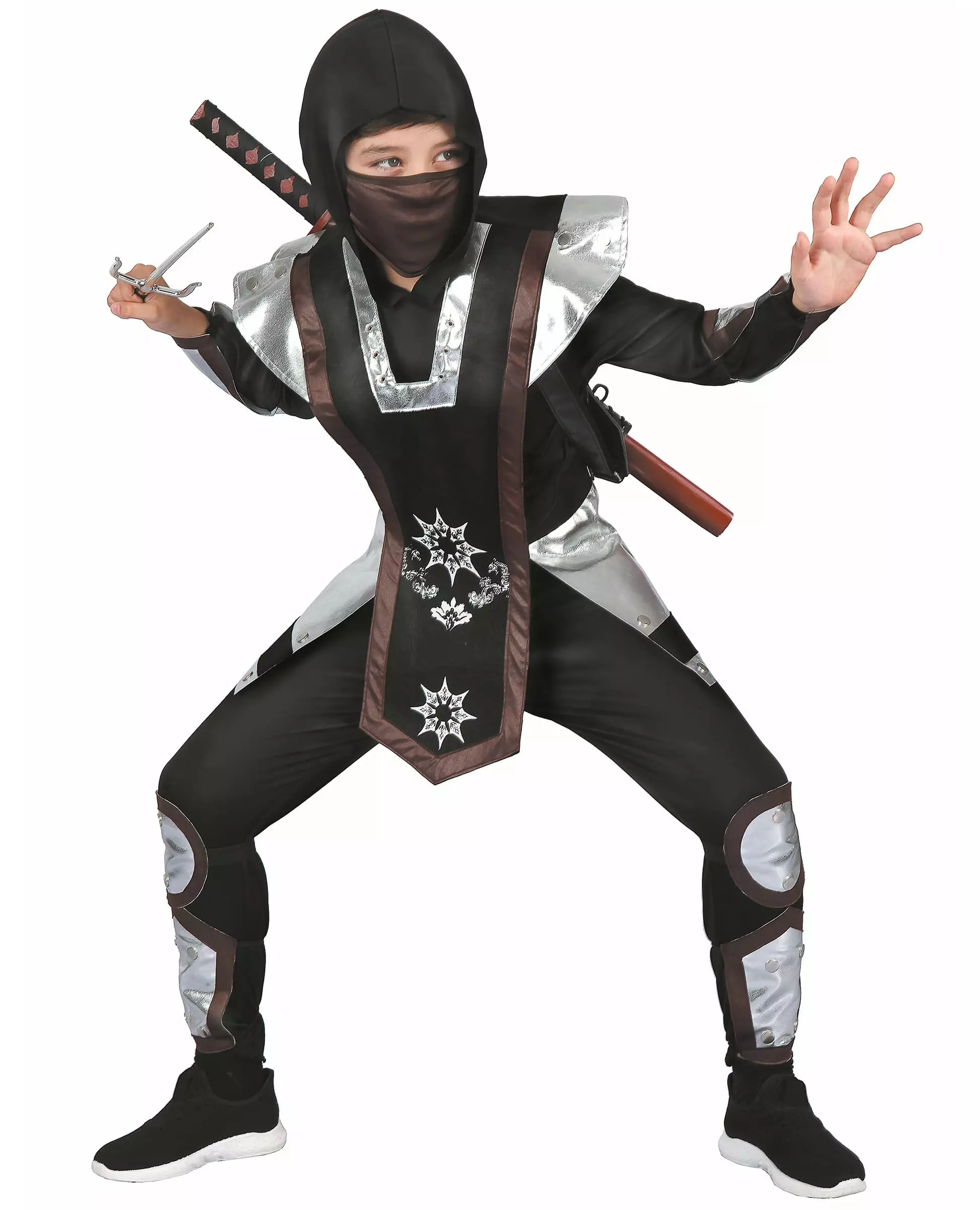 Become a true ninja master in this costume! This ninja costume for children consists of a hooded top, pants, armor, a belt, a mask, cuffs, leg guards, and knee pads (weapons and shoes not included). The top and pants are black. Fabric armor covers the torso. It is black, with brown and silver-gray edges. Cuffs, leg guards, and knee pads cover the arms and legs. They are held in place with elastic bands. Finally, a belt and a mask add the finishing touch to the ensemble. With such a ninja costume, your child will be the king of the Carnival. Accessories included: Top Pants Armor Belt Mask 2 Cuffs 2 Leg guards 2 Knee pads Material: 100% Polyester Care: Hand wash