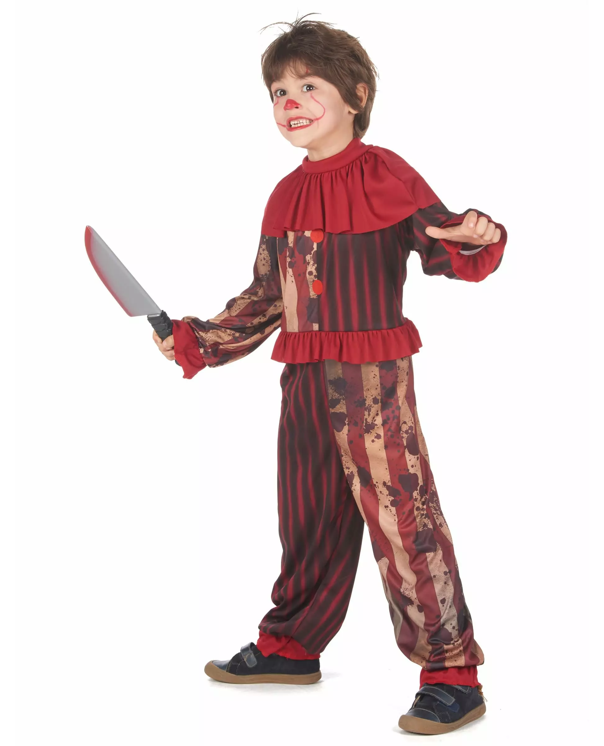 Dress up your son as a terrifying clown! This terrifying clown costume for boys includes the collar and jumpsuit (knife, ball and shoes not included). The jumpsuit is red with stripes. It looks bloody thanks to the several blood stains. It is decorated with different red frills at the waist as well as at the wrists and ankles. The sleeves are wide and tightened at the wrists. The collar is red and falls on the shoulders. Your boy will be the scariest with this terrifying clown costume at a Halloween party! Product number 303941 Availability M 7-9 years (120-130 cm) 303941, L 10-12 years (130-140 cm) 303939, Care and washing Hand wash Accessories included - Jumpsuit - Collar