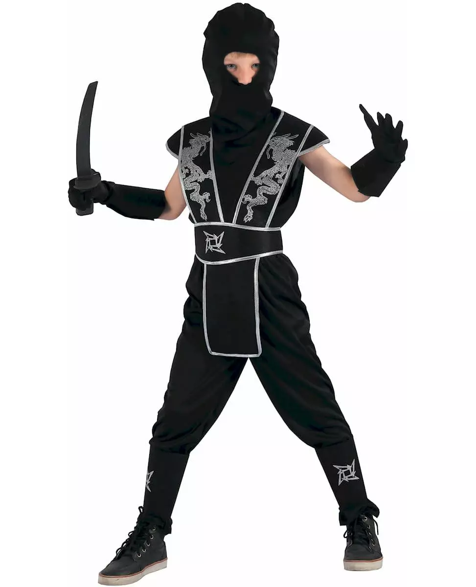 Become a great ninja master This ninja costume for children consists of a top, pants, a hood, a breastplate, a belt, a pair of gloves and leg guards. The hood, top and pants are black. The top closes with Velcro and the pants have an elastic waistband. The breastplate is black and silver. It is held securely in place with the belt. This closes with Velcro. The leg guards are black with a silver pattern representing a ninja star. They close with Velcro. The gloves are black and close on the side with Velcro. This ninja costume will be perfect for Carnival. Accessories included: Top Pants Belt Armor 2 Leg guards 2 Cuffs Hood Material: 100% Polyester Care: Hand wash