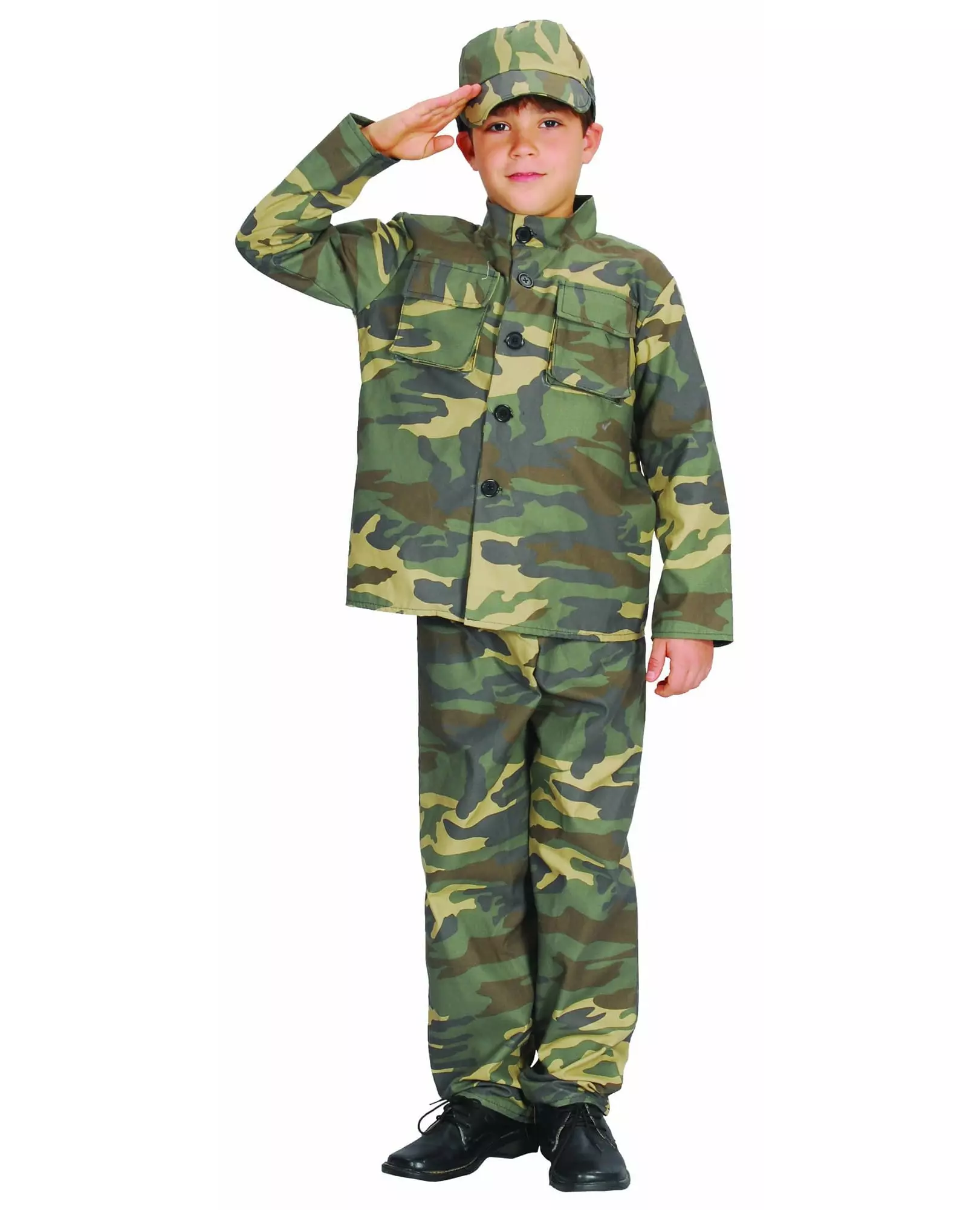 Camouflage print! This military costume for children includes a button-up jacket, elastic waist pants, and a cap. The entire outfit is camouflage-printed, just like a real soldier's outfit! This costume will be ideal for Mardi Gras or your fancy dress parties! Accessories included: Pants Jacket Cap Material: 100% Polyester Care: Hand wash