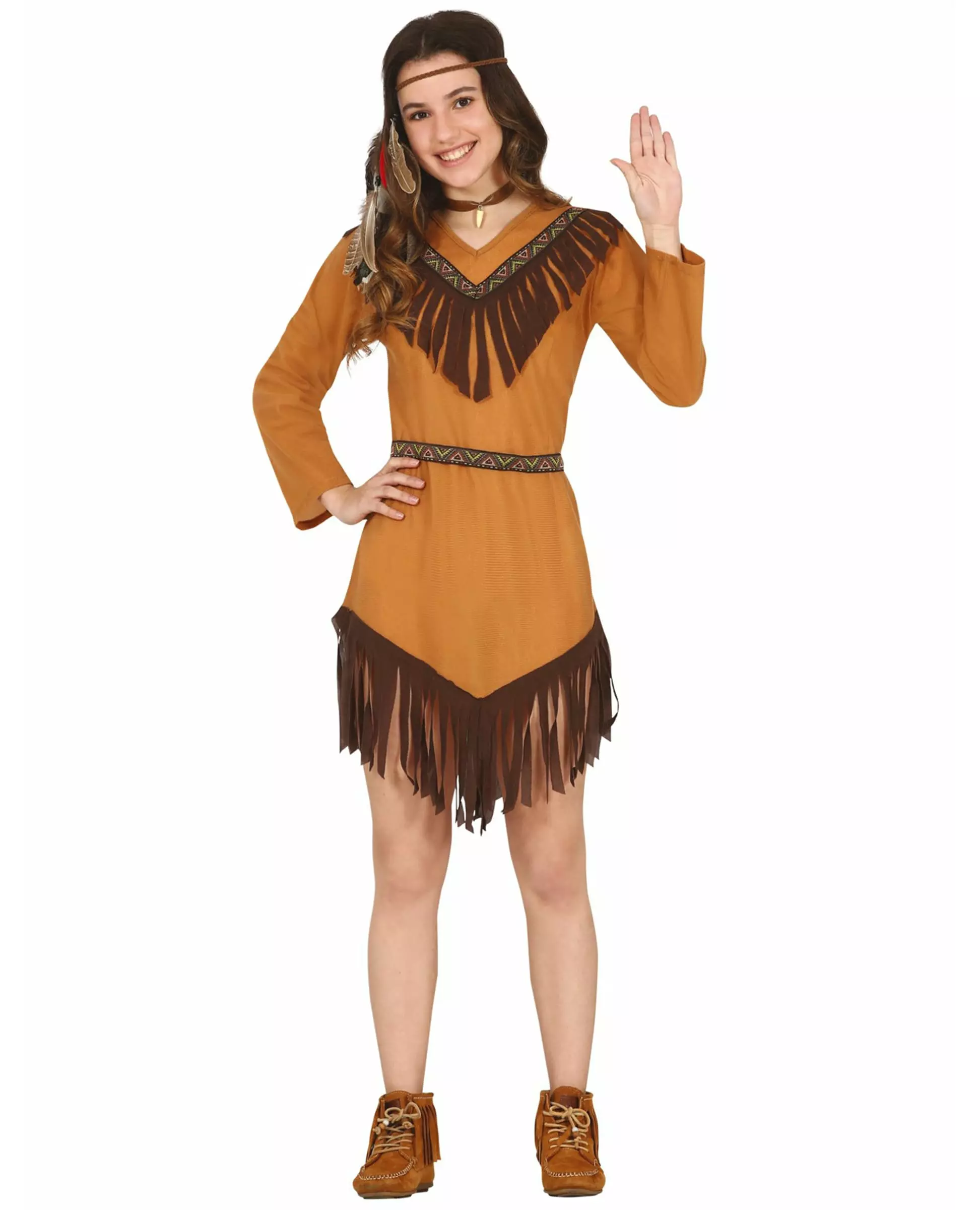 Perfect for a Western evening! This Indian costume is for teenagers. It includes a dress. The long-sleeved dress is made of light brown fabric with a V-shaped cutout at the collar and skirt. Pretty dark brown fringes are present on the collar and the bottom of the dress for a realistic effect. Finally, colorful ethnic patterned edging highlights the collar and waist. An ideal Indian costume for celebrating a Carnival or any other fancy dress party. Accessories included: Dress Material: 100% polyester Care: Do not machine wash or iron
