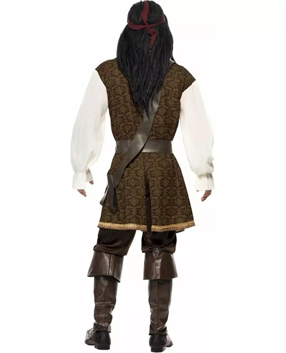 Take on the oceans in this pirate costume! This men's pirate costume consists of a top, pants, a belt, a bandana, and a belt with a sheath. The top has long sleeves and is off-white. A long brown jacket is sewn onto the top. The jacket is decorated with embroidery and gold buttons. The brown pants have an elastic waistband. A matching belt accentuates the waist and cinches the outfit. A matching belt and a burgundy scarf complete the outfit perfectly. This pirate costume will be perfect for playing a bloodthirsty pirate at your pirate-themed fancy dress parties or at Carnival. Accessories included: Top Pants Belt Scarf Belt with sheath Material: 100% polyester Care: hand wash