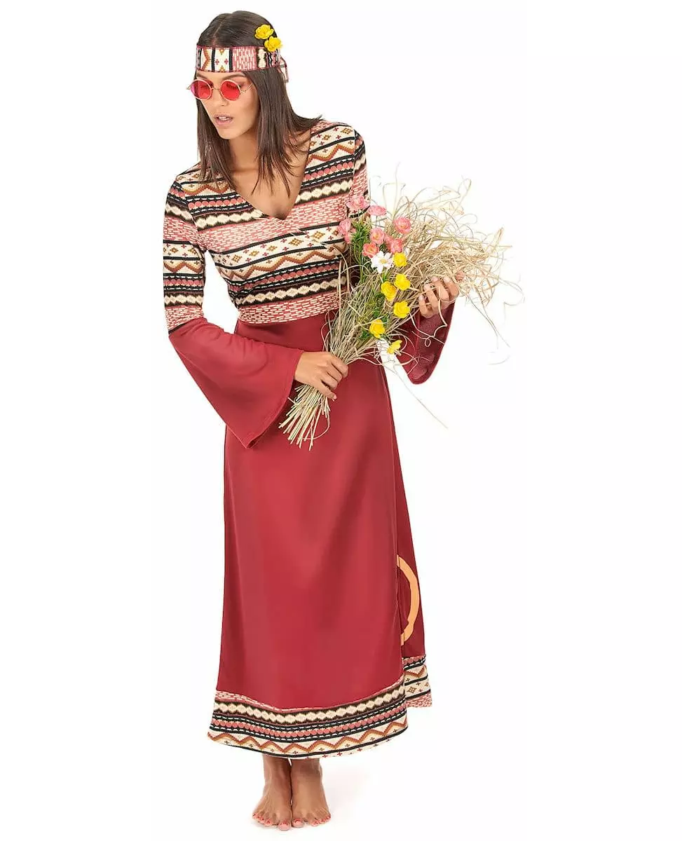 Step back into the 70s with this costume! This women's hippie costume consists of a dress and a headband. The long dress is burgundy in color. It has long, flared sleeves and a V-neck. The top is colorful, and the "peace and love" sign is printed on the bottom of the garment. Two straps at the back will allow you to cinch the dress at your waist, and the elastic fabric will adapt perfectly to your body shape. Finally, a matching headband will add the finishing touch to this outfit. This hippie costume will be perfect for stepping back into the yéyés during your retro costume parties. Accessories included: Dress Headband Material: 100% polyester Care: Hand wash