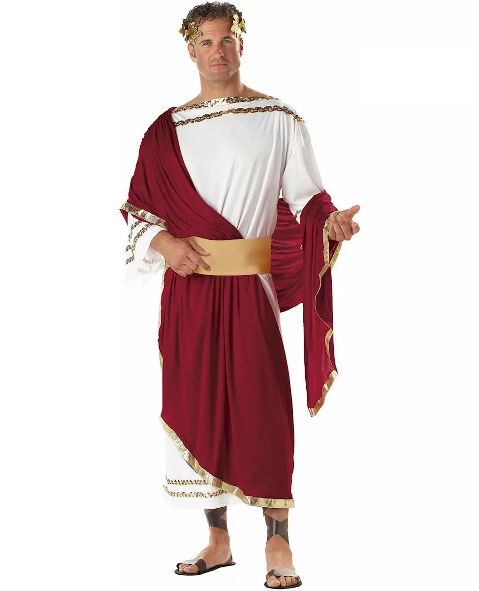 Hail Caesar! This Caesar costume for men consists of a dress, a scarf, a belt, and a laurel wreath (shoes not included). The dress is white. The sleeves are long and flared, and there are gold sequin trims at the ends. Its elastic waistband will adapt perfectly to your figure. The burgundy scarf will easily fit over your shoulder. It is long and decorated with gold trim. A wide gold belt will allow you to cinch the garment at the waist. Finally, a gold laurel wreath will add the finishing touch to this outfit. This very good quality costume will be perfect to transform you into Caesar for a fancy dress party with friends. Accessories included: Dress Scarf Belt Crown Material: 100% polyester Care: Hand wash Measurement information: For size L, dress approximately 140 cm long