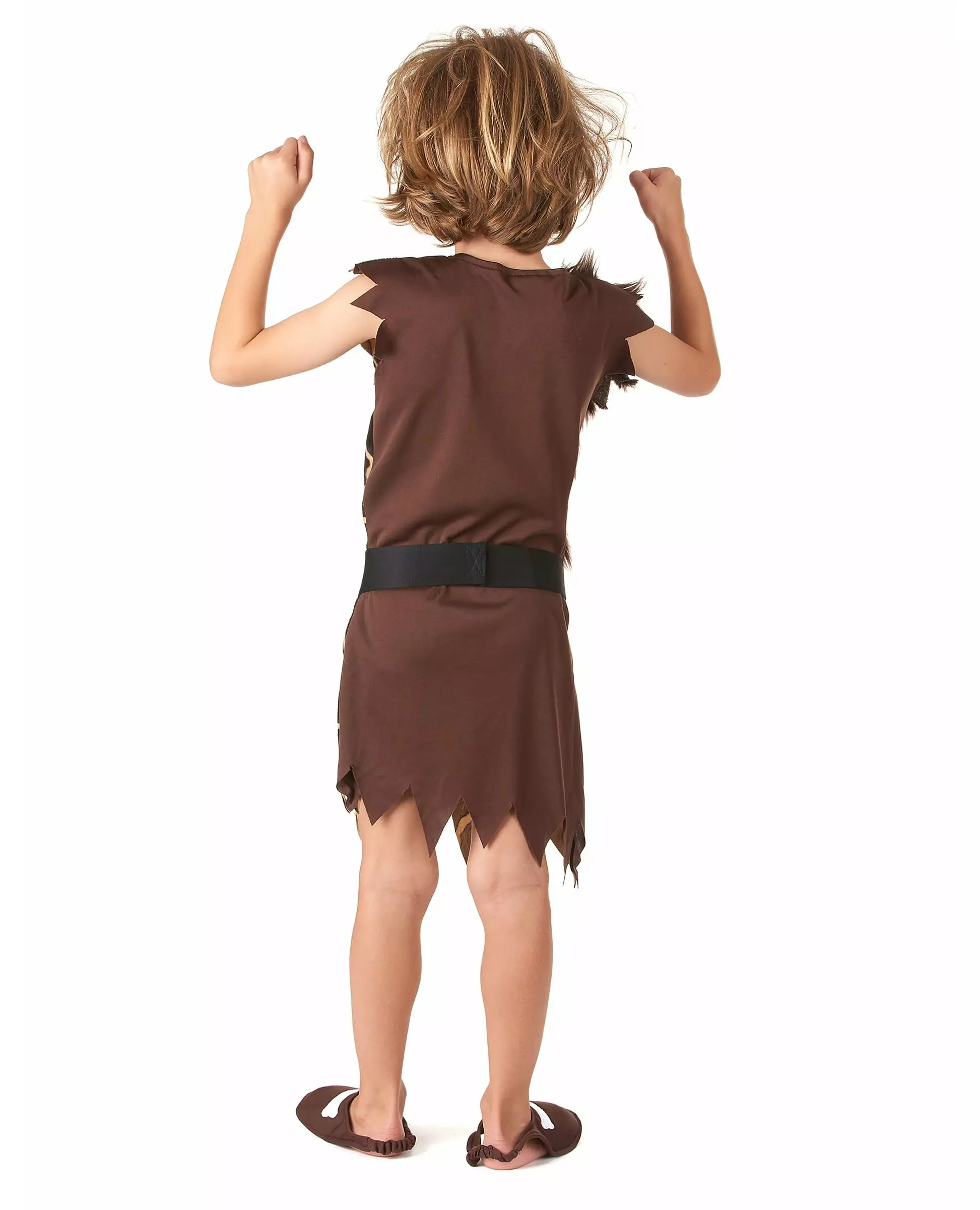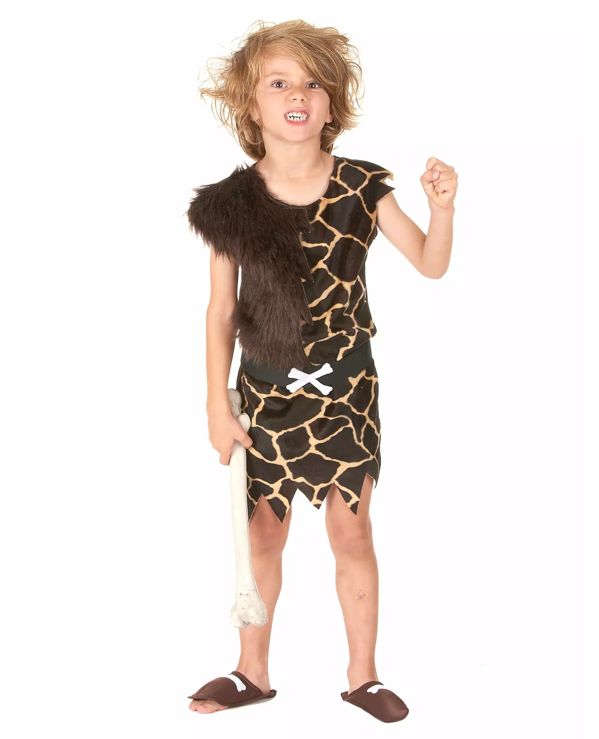 Graouuu This costume, straight out of prehistory, is for children and includes a tunic, a belt, and overshoes (the rest is not included). The tunic has very short sleeves cut in a sawtooth pattern, just like the bottom of the tunic. Only at the front, the fabric has a velvet feel and a "giraffe" print. A fake animal skin covers part of the torso; it is made of long brown synthetic hair. The belt is made of thick black felt, decorated with two crossed bones on the front. It attaches in the back with a Velcro fastener. Finally, the overshoes are shaped like small slippers with elastic at the back and another elastic underneath to attach them to the shoes. Made of brown fabric padded with foam, small white bones are flocked on the top. Enough to adorably transform your child into a Cro-Magnon man or woman for a show, Carnival or for a prehistoric-themed birthday party!. Accessories included: Tunic Belt Foot Cover Material: 100% Polyester Care: Hand washable