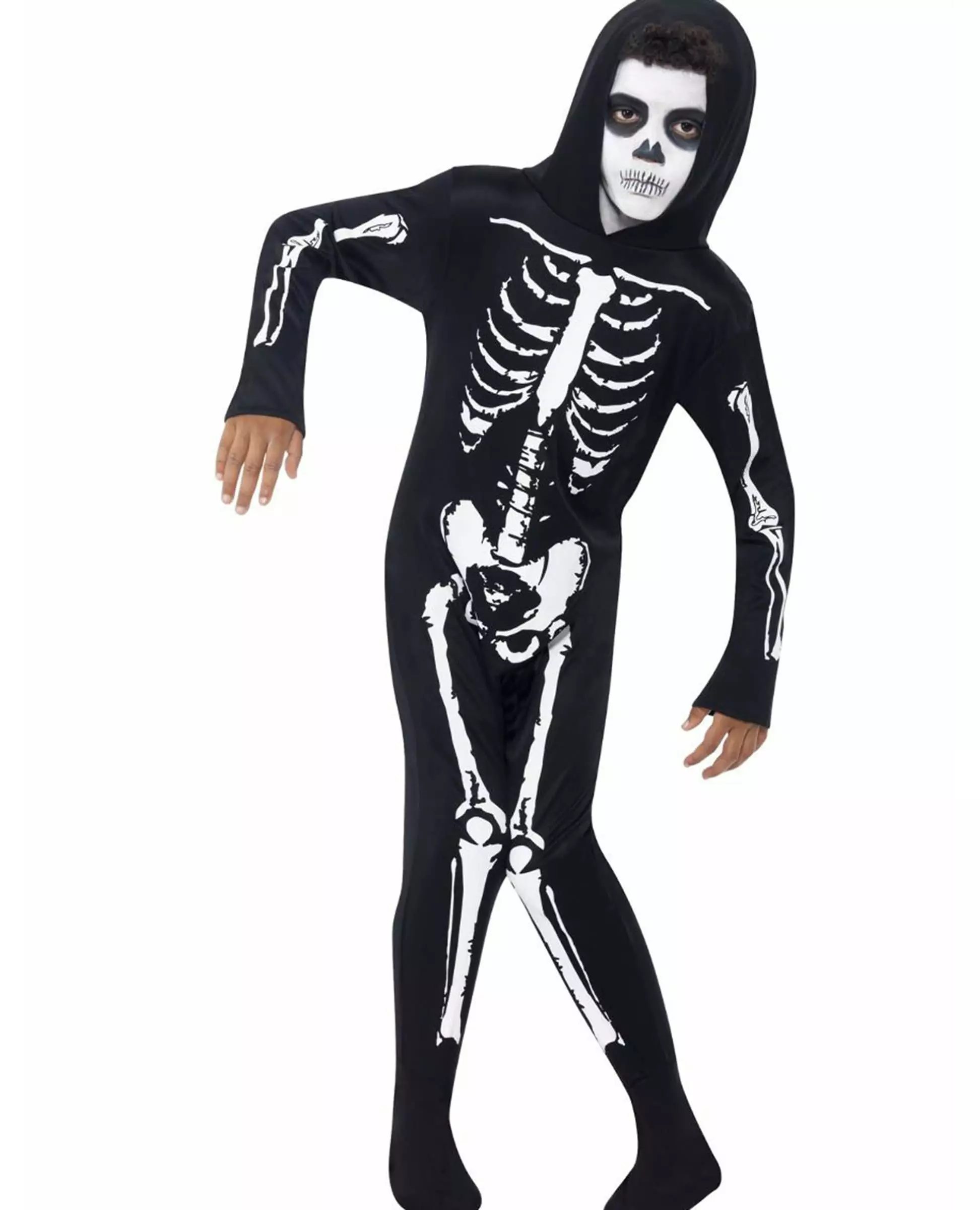 Dress up your son as a skeleton for Halloween This skeleton costume for children consists of a jumpsuit (makeup not included). The long-sleeved jumpsuit is black with a white skeleton printed on the front. It also has a hood to cover the top of the head. This costume will be perfect for parading through the streets on Halloween night. Accessories included: Hooded jumpsuit Material: 100% Polyester Care: Hand wash