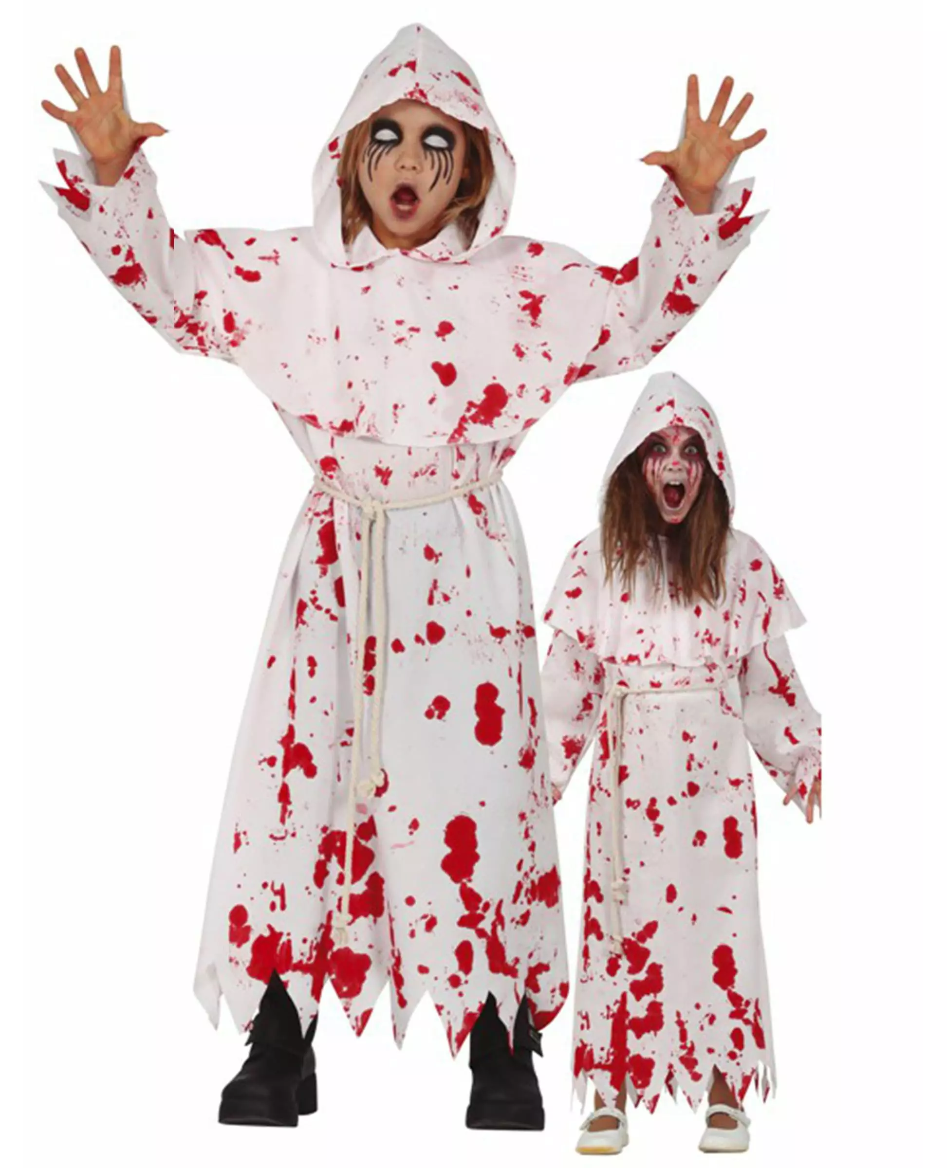 Fake blood printed on the costume to make it even scarier! This bloody religious costume is for children. Composed of a long tunic and a rope that acts as a belt (shoes and lenses not included), the bloody costume is entirely white with fake blood stains printed all over. The bottom and sleeves are cut out to emphasize the terrifying side of the costume and a hood is also present. A great bloody costume for children that will be a sensation at your Halloween party! Material: 100% POLYESTER. Accessories included: Tunic with hood Belt Care: Hand wash