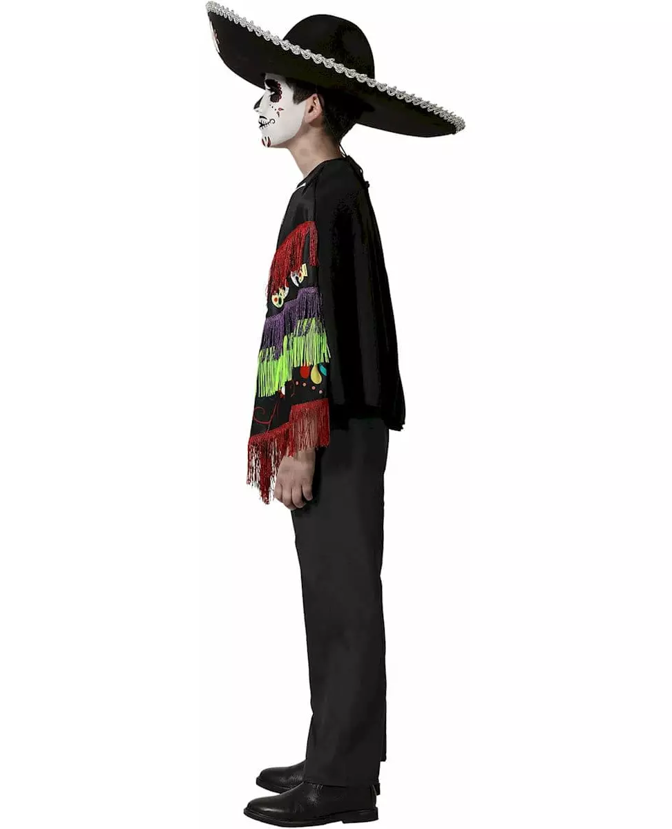 A Halloween day in the colors of the Day of the Dead! This Dia de los Muertos skeleton poncho costume is for children. It contains only a poncho. The poncho is in the colors of the famous Mexican festival "Dia de los Muertos" (black, purple, red, yellow, and white). The costume features skull and flower patterns. It is made up of a row of red, yellow, and purple fringes. Complete your Dia de los Muertos-themed outfit for your Halloween party with friends! Accessories included: Poncho Material: 100% Polyester Care: Hand wash
